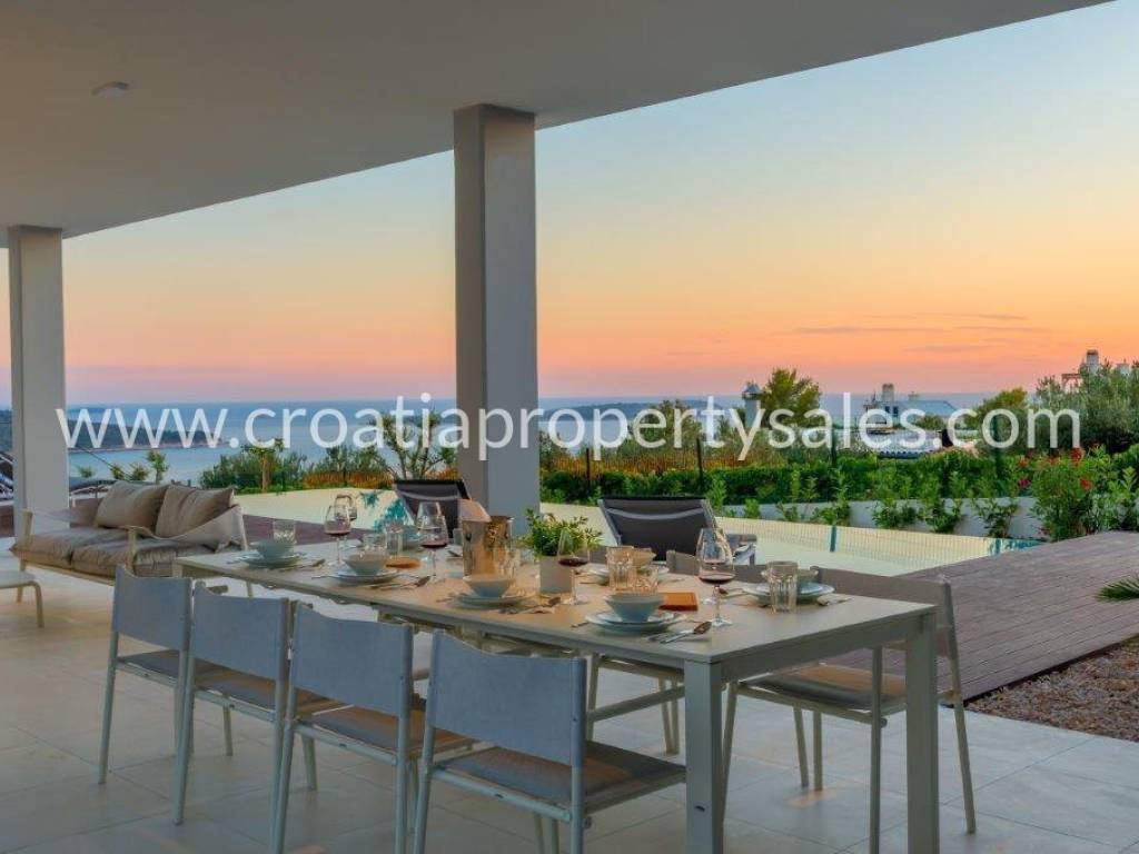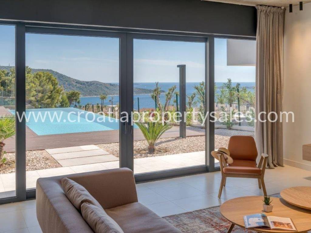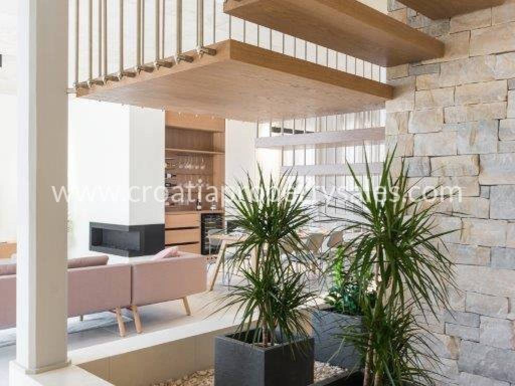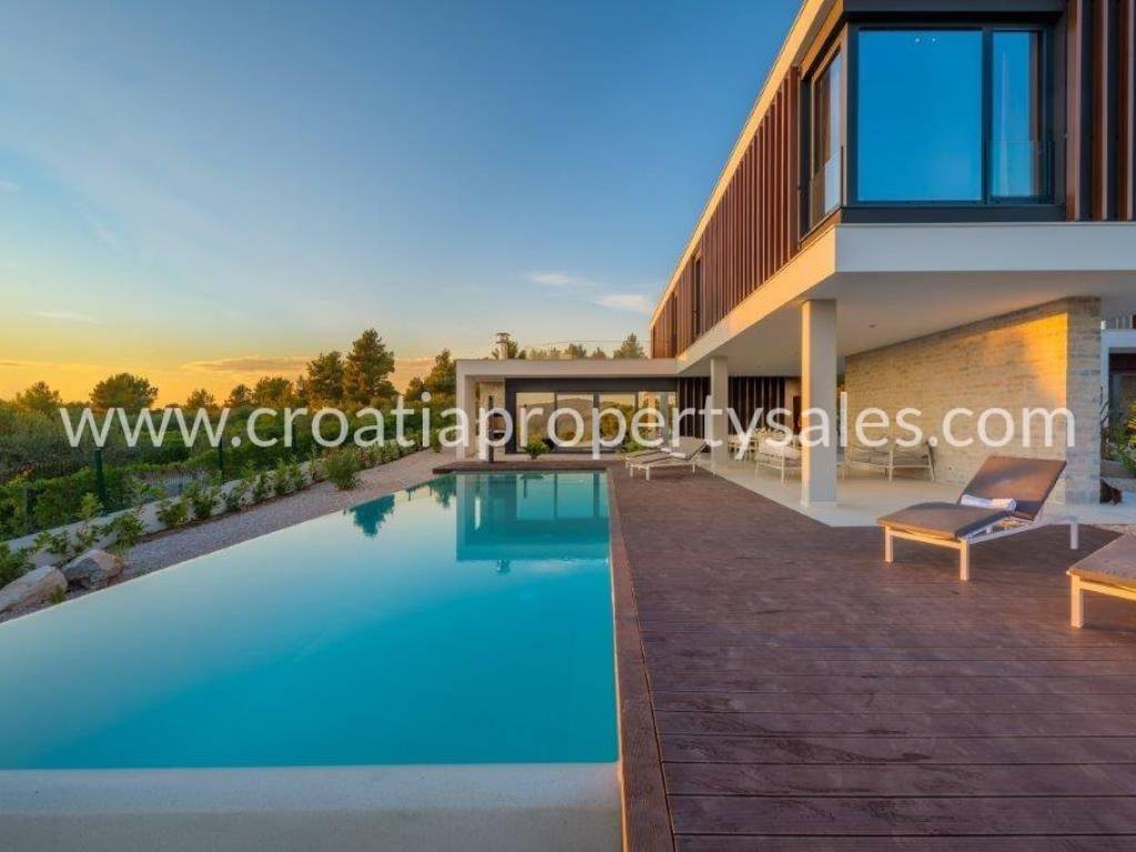 Superb, detached luxury villa with a beautiful sea view. The villa is located on a plot of 962 m2 and has a living area of 300 m2. It consists of a living room, dining room and four bedrooms with ensuite bathrooms. Due to its micro-location, the villa offers peace and enjoyment of true Mediterranean environment, and yet it is close to the center. It offers fantastic view of the sea and city of Primosten.