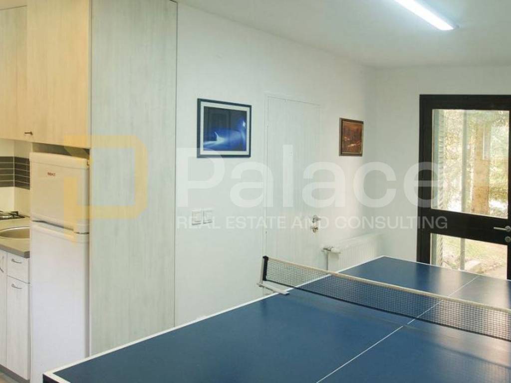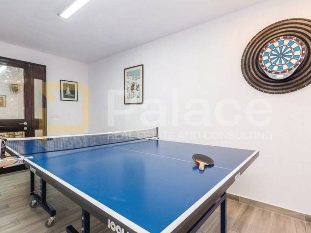 A special part of the house is the lower floor, designed for entertainment and socializing equipped with table tennis, darts, table football, and billiards, along with an additional kitchen and space for central heating.