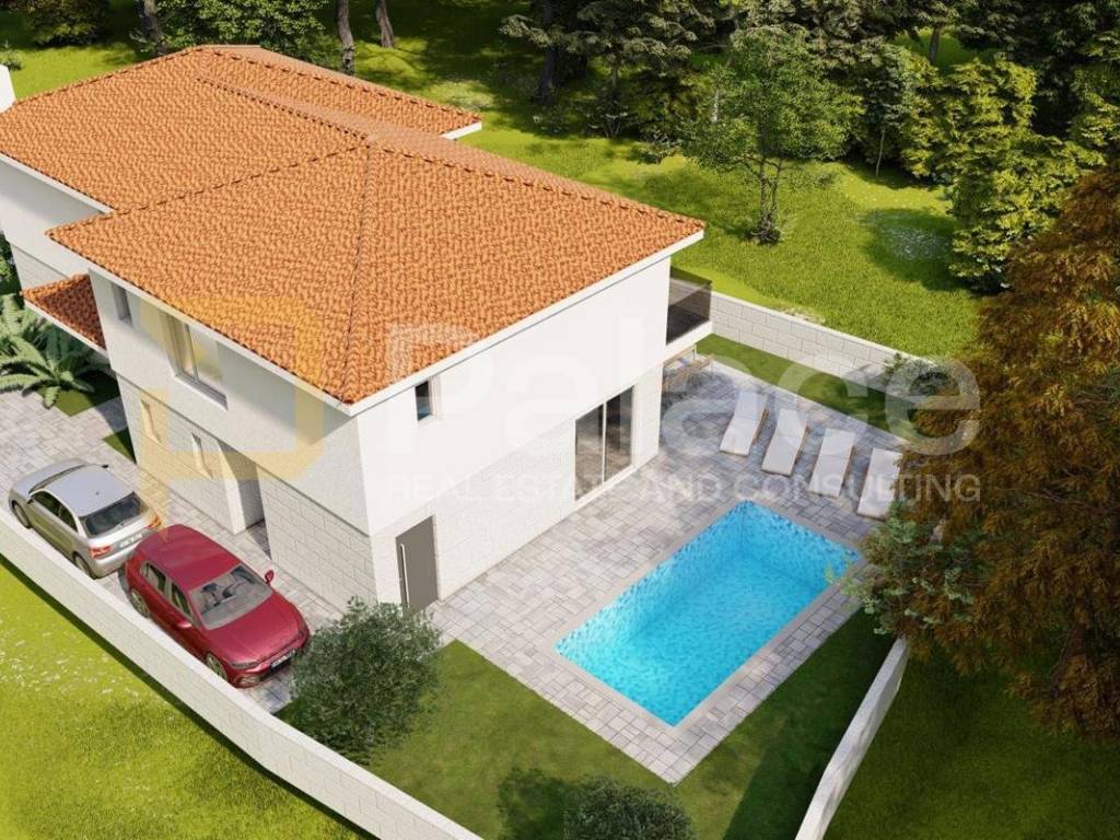 In a tranquil location in the settlement of Hlapa, on the eastern part of the island of Krk, an elegant detached semi-detached villa under construction is located, consisting of two separate residential units. Perfectly integrated into the natural surroundings, this property offers a high level of privacy, modern amenities, and refined comfort - ideal for a large family, multi-generational living, or as an investment for tourist rental.