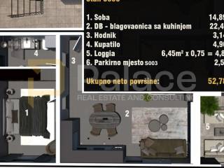 For sale, a one-bedroom apartment of 53 m located in a quality new building in Medulin, in an exceptional location - just a few steps from the sea. The apartment is situated on the first floor and consists of a spacious living room with a kitchen, one bedroom, a bathroom, and a balcony.
