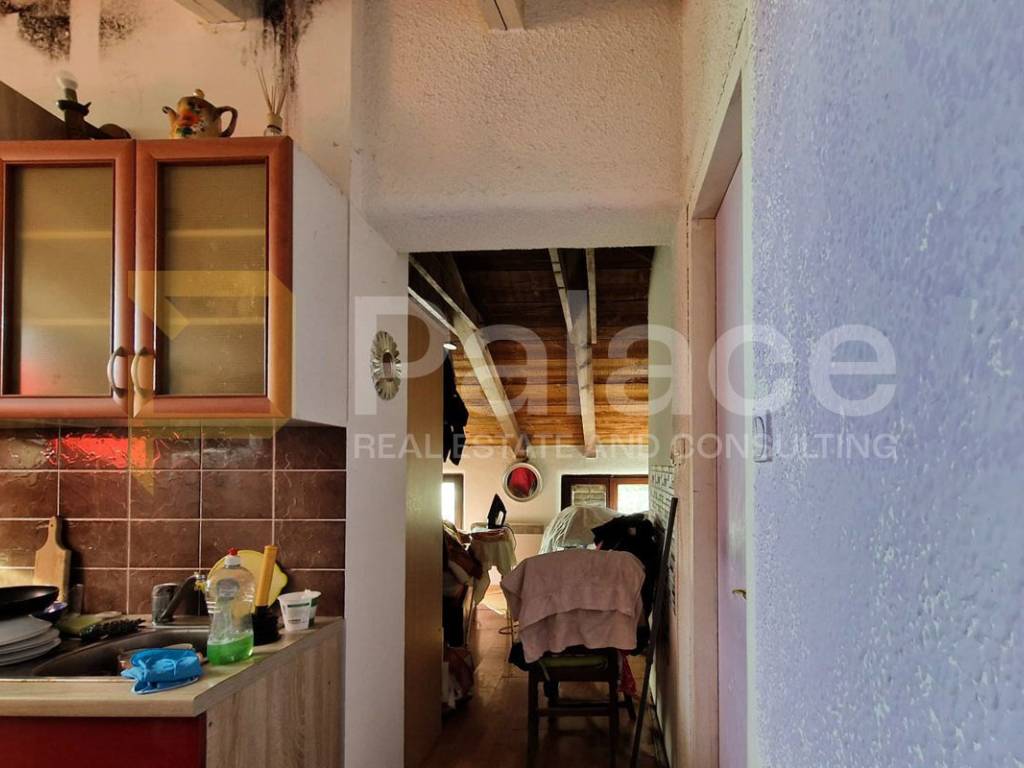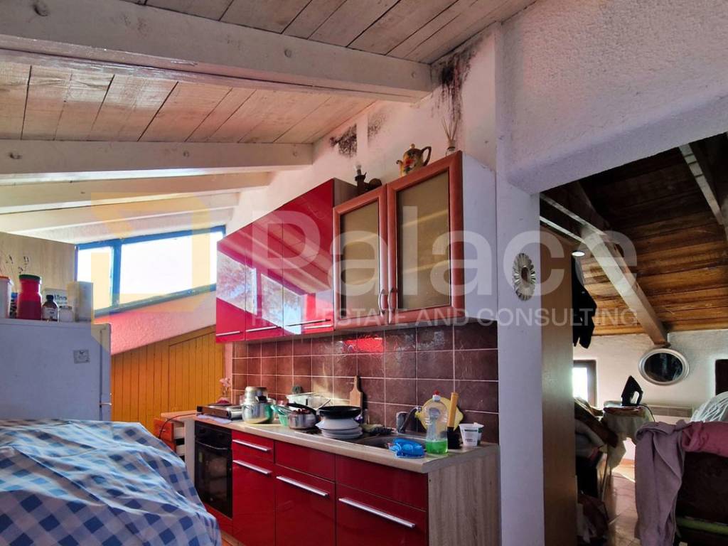 The upper floor, with its practical layout, already includes a kitchen, a multipurpose space that can be used as a living room or bedroom, and a bathroom with a shower area separated by plaster walls. With some investment, this floor can become a fully functional one-bedroom apartment with a private entrance.