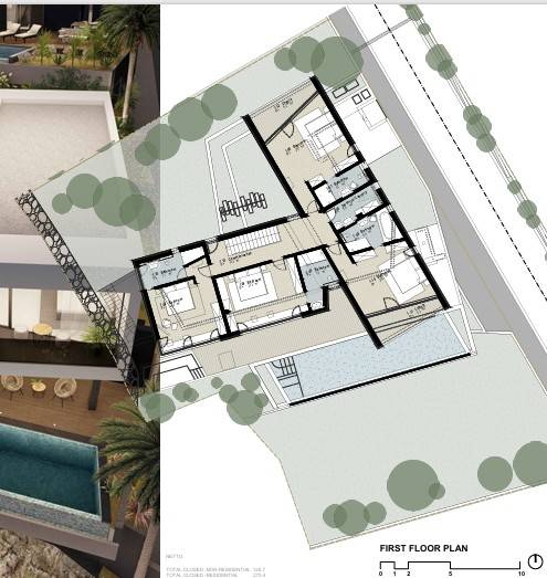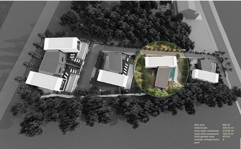 Villa "B" is the second in line and is located on a plot of land totaling 804 m2. It consists of a basement, which is also a garage, ground floor, and a flat roof.