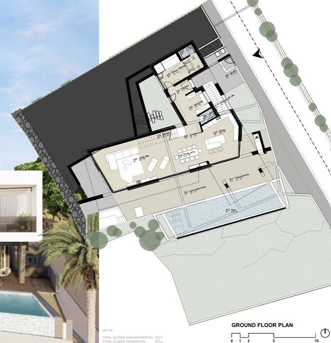 On the ground floor of the villa, there are living spaces, covered and uncovered south terraces, and a pool.