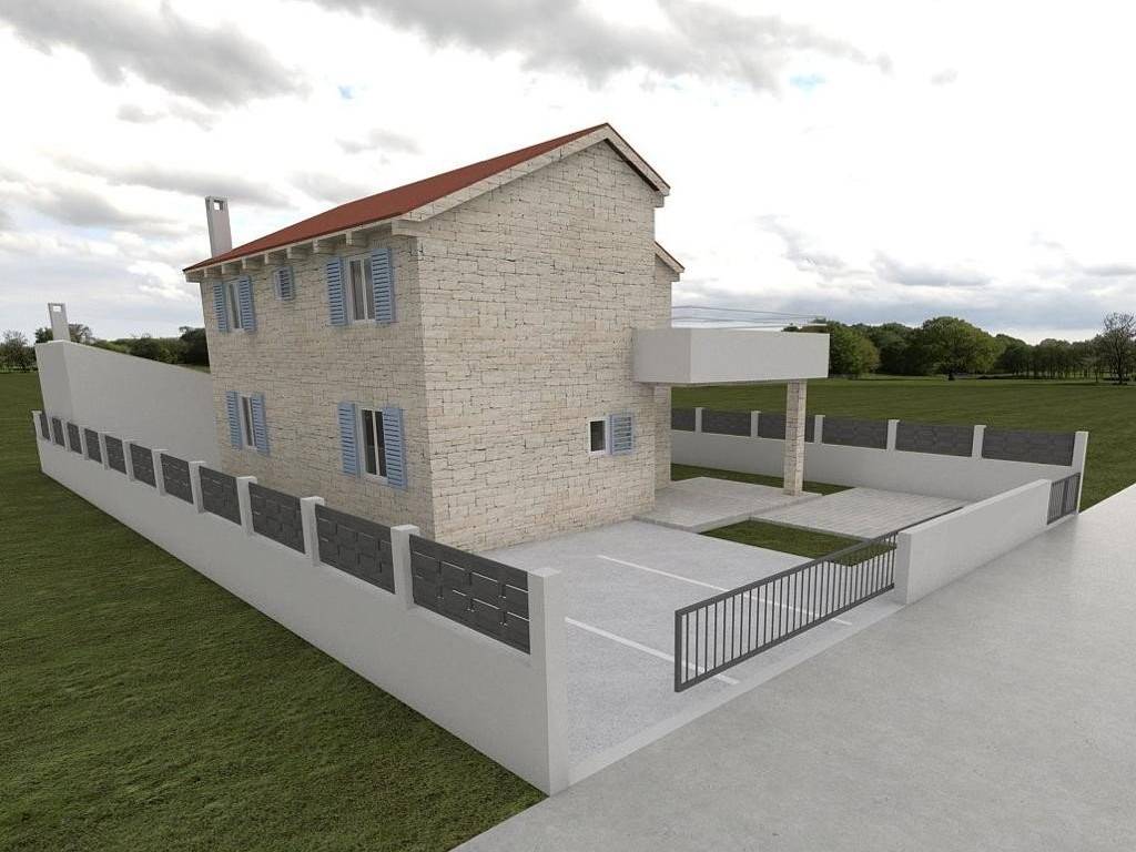 In the small village of Vrsi near Zadar, there is a beautiful Mediterranean-style stone house for sale in a new building, with an area of 165m2. The house consists of a ground floor and a first floor, on the ground floor at the entrance you are greeted by a covered porch, the entrance to the house, one bedroom, a bathroom, a spacious "open-space" kitchen with a dining room and a living room that leads you through the glass walls to a wonderfully spacious yard .