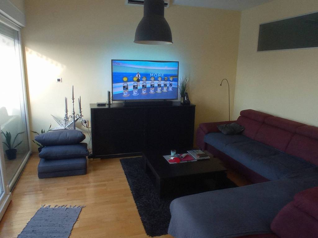 The apartment consists of a large open space living room with kitchen and dining area, three bedrooms, two bathrooms, a large terrace facing Sjenjak, a large balcony facing the courtyard, a storage room, and a hallway.
