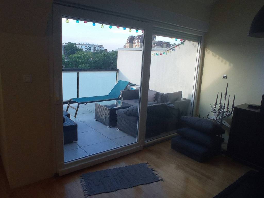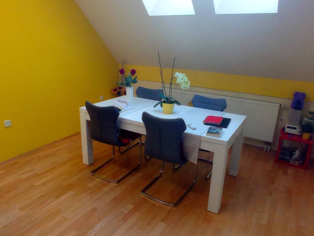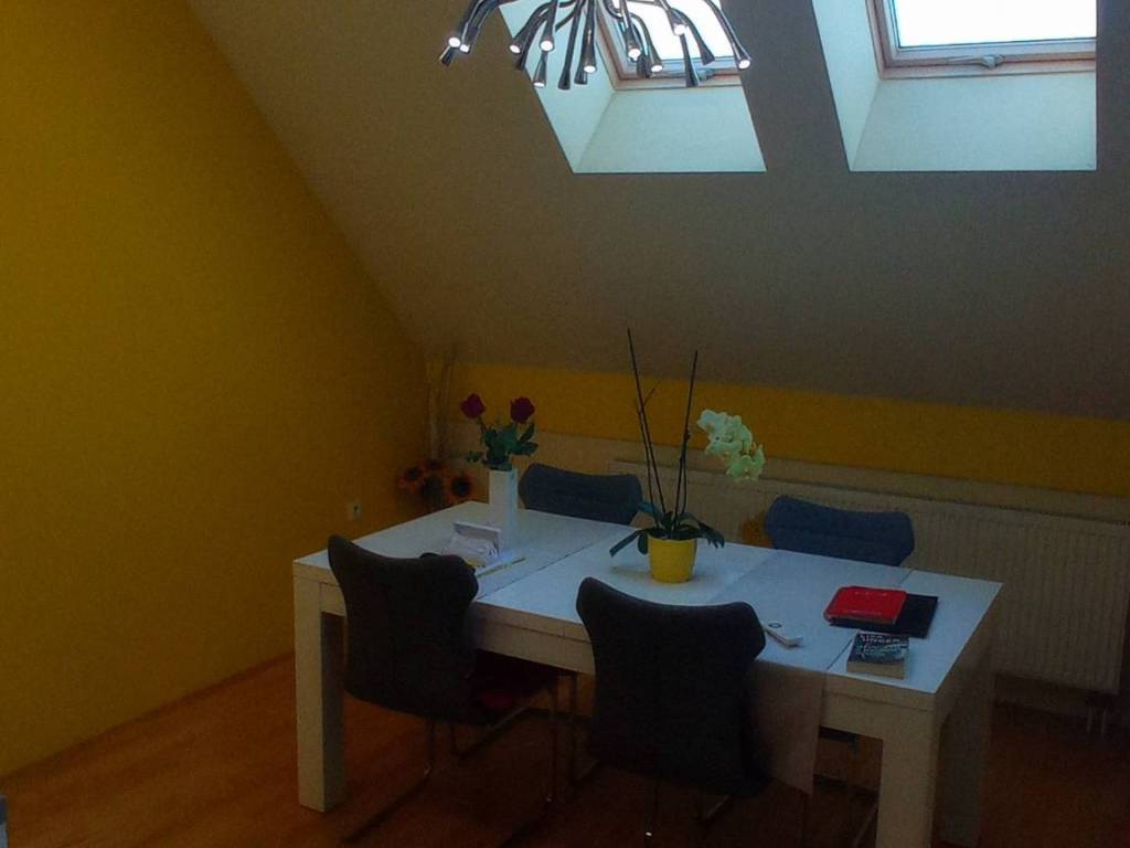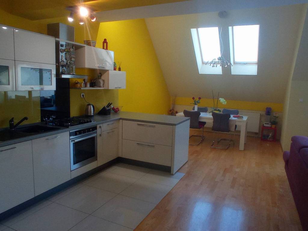 The penthouse is located on the fifth floor and attic of a well-built residential building in Divaltova Street, in close proximity to all necessary amenities such as public transportation, kindergarten, elementary school, shopping centers, health center, post office, church, stadium, City Garden park, and the future new clinical hospital.