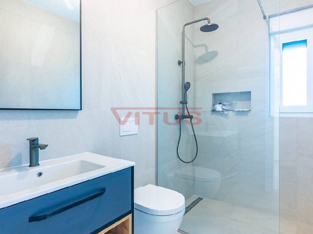 The apartment of 80 m2 is located on the first floor of a modern apartment building in Malinska. It consists of two bedrooms, two bathrooms, storage room, kitchen, dining room and living room with access to a spacious terrace with an open view of the sea. The apartment is equipped with underfloor heating in the bathrooms and air conditioning, and it has one parking space.