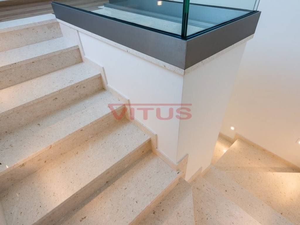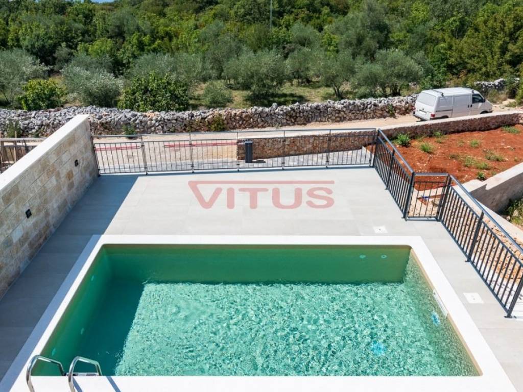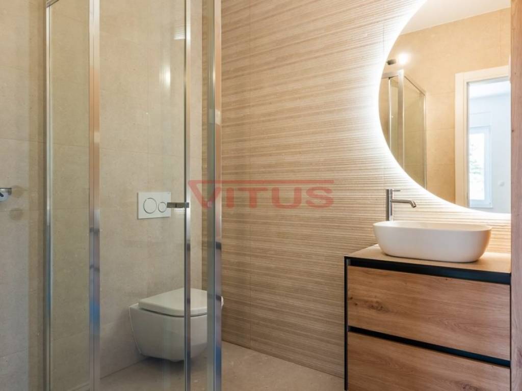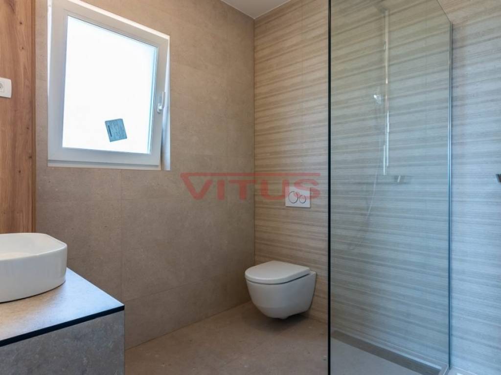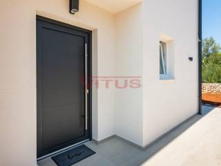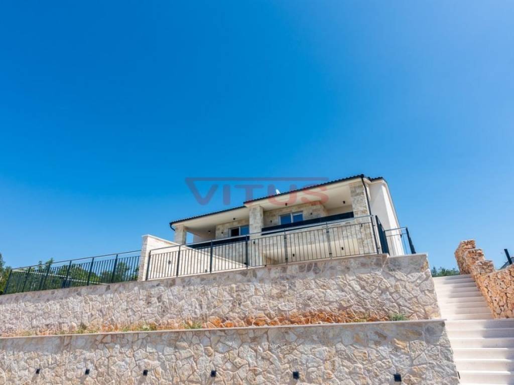 A semi-detached villa of modern design with a size of 151.83 m2 is located in a quiet area near Malinska. It consists of ground and first floor. On the ground floor there is an entrance hall, a toilet, a storage room and a spacious, open space consisting of a kitchen with a dining room and a living room. The living room has access to a covered terrace with direct access to the swimming pool with a sun deck and an outdoor fireplace with a summer kitchen. Upstairs there are three bedrooms with private bathrooms and a covered terrace with a beautiful, open view of the sea. There are parking spaces for two cars in the garden. During the construction of this luxury property, top-quality materials were used. The villa is located in a beautiful and quiet area surrounded by a green belt, 1000 m from the sea.