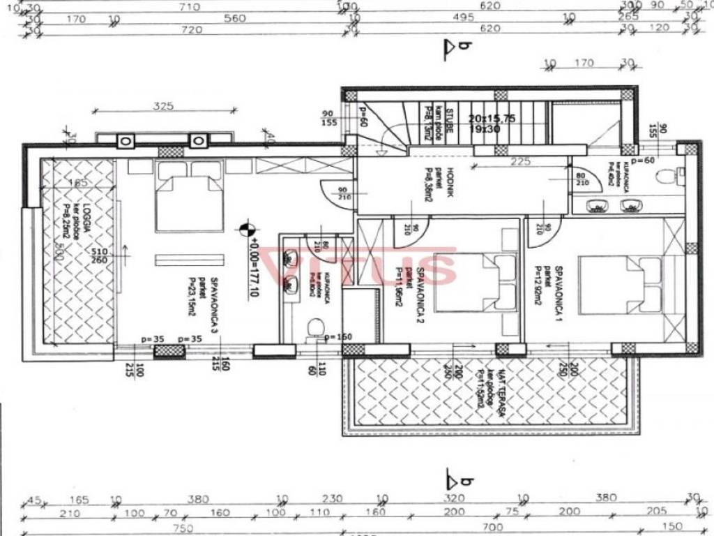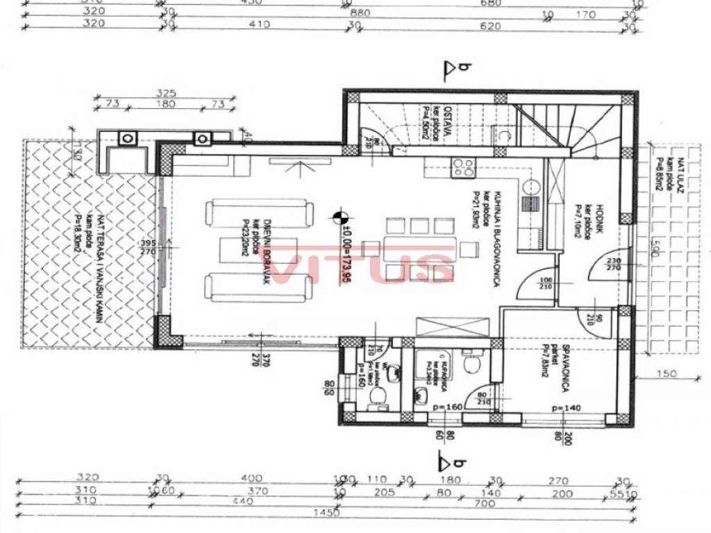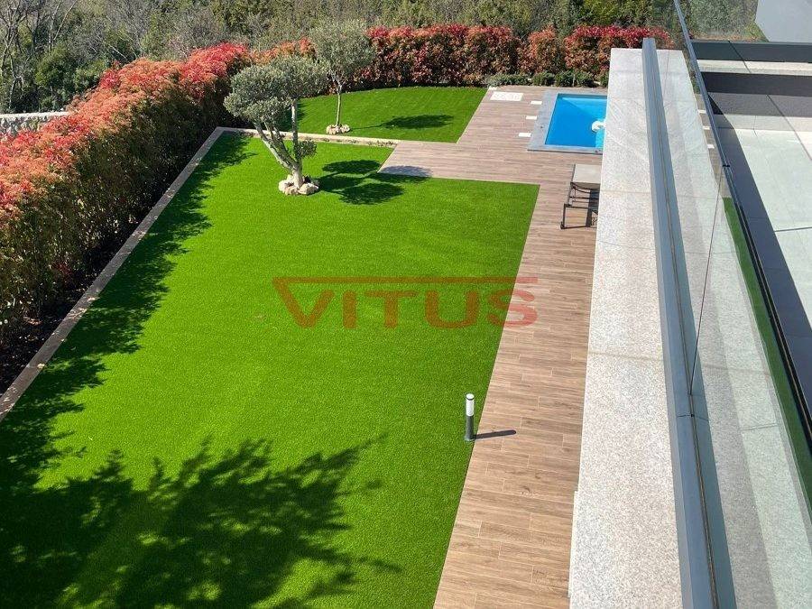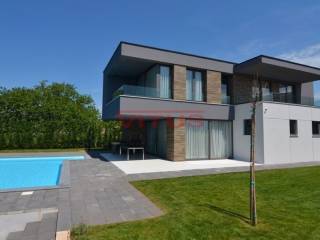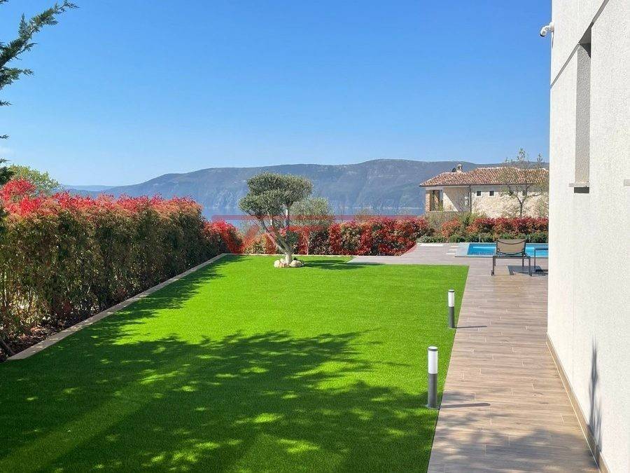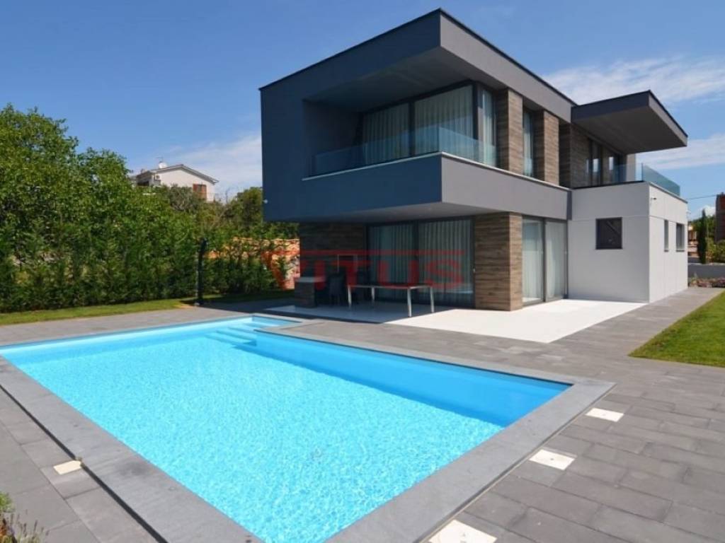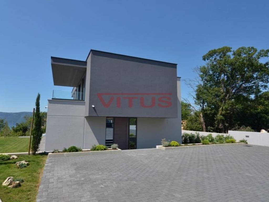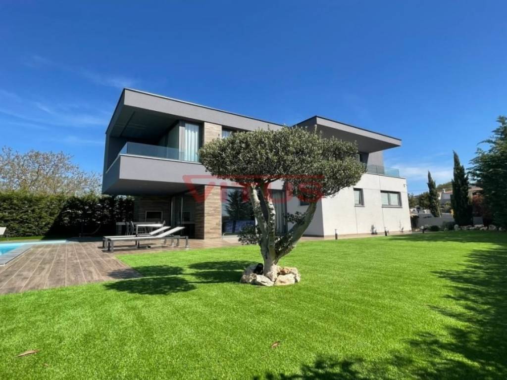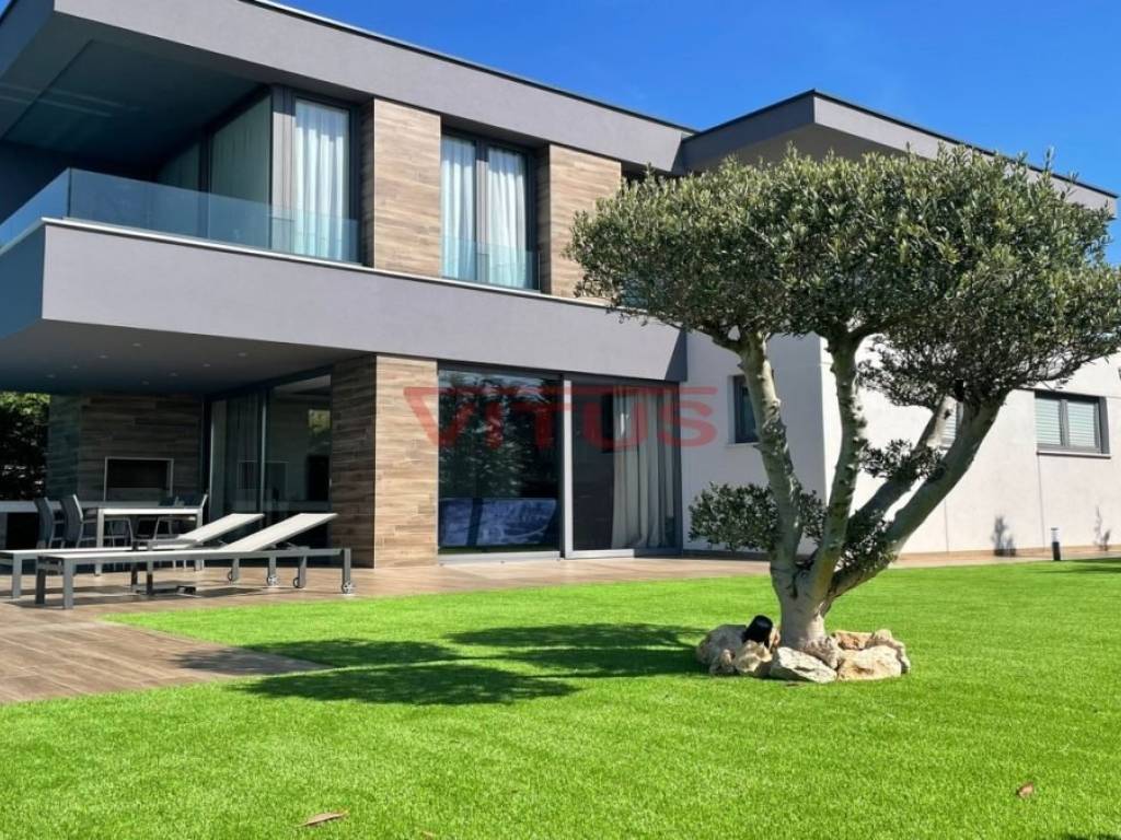 A modern villa with a total living space of 169.35 m2 is located in the surroundings of the town of Krk. It consists of ground and first floor. On the ground floor there is a kitchen and dining room, a spacious living room, a bedroom with its own bathroom, a storage room and a toilet. The living room opens onto a covered terrace. On the first floor, there are three bedrooms with access to the terrace with a panoramic sea view. One bedroom has its own bathroom. There is also an additional bathroom on the first floor. There is a swimming pool with a sunbathing area, an outdoor grill and a space for parking of several vehicles in the beautifully landscaped garden. Quality construction and equipment, ALU carpentry, large lifting and sliding walls with three-layer glass, four inverter air conditioners, electric underfloor heating of the entire building with the possibility of regulation via smartphone or computer, video surveillance. In a quiet part of the island, it is 1000 m from the sea.