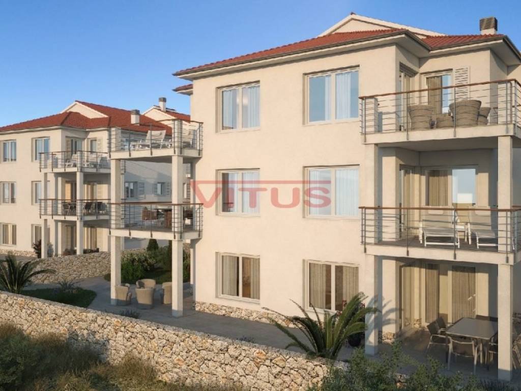 Unique location, first row to the sea! The apartment with a total net size of 72,06 m2 is located on the ground flour of an apartment building in Šilo. It consists of an entrance hall, kitchen with dining room and living room, toilet, two bedrooms and a bathroom with a net living size of 68,74 m2. The living room has access to a terrace with open sea views. The apartment has a storage space of 6,64 m2 and a parking space in the yard. Quality construction and equipment, quiet area by the sea!