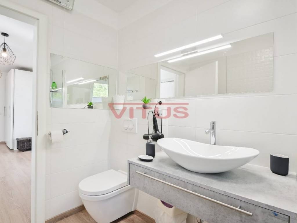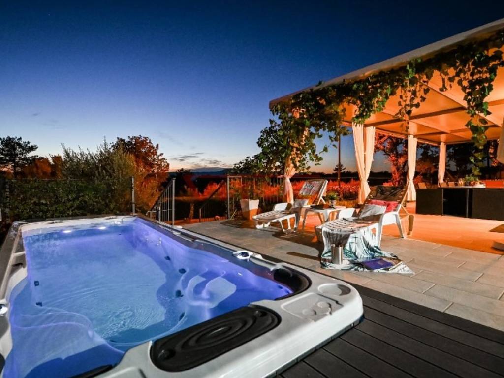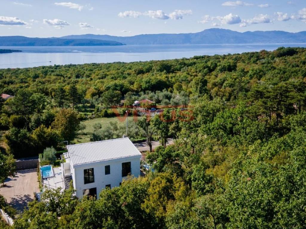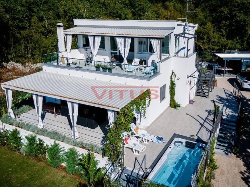 This detached villa of 174 m2 is located in a small village near Malinska. It was built on a plot of 917 m2 which allows peace and privacy, and consists of ground floor and first floor. The ground floor has an open space consisting of a kitchen, dining room and living room, and two bedrooms, two bathrooms and a laundry room. The living room has direct access to a covered terrace with sun deck and swimm-spa pool. First floor is connected by external stairs where are two bedrooms and two bathrooms and a covered terrace with kitchen. In the spacious garden there is a gazebo with barbecue and parking for several cars. The house is decorated with attention to every detail and is sold furnished. It is equipped with modern furniture and appliances, air conditioning, floor coverings and high quality sanitary ware, and has the possibility of wood heating, which makes it an ideal property for a quiet holiday and enjoyment throughout the year. It is located in a quiet area, surrounded by a green belt, 1500 m from the sea.
