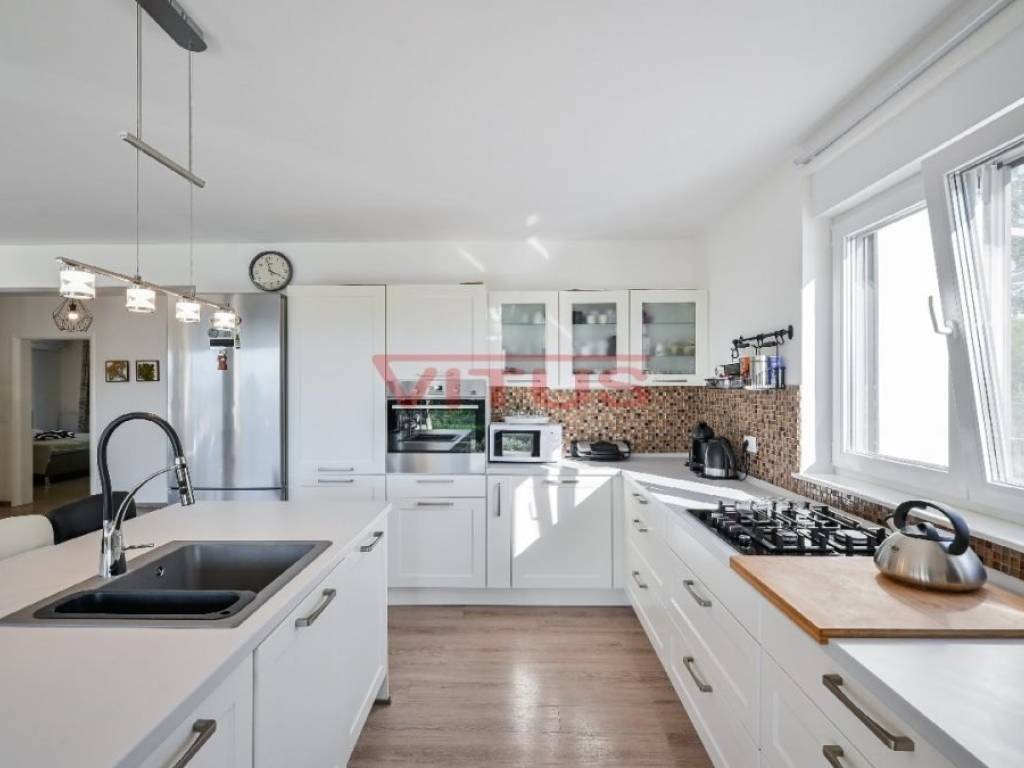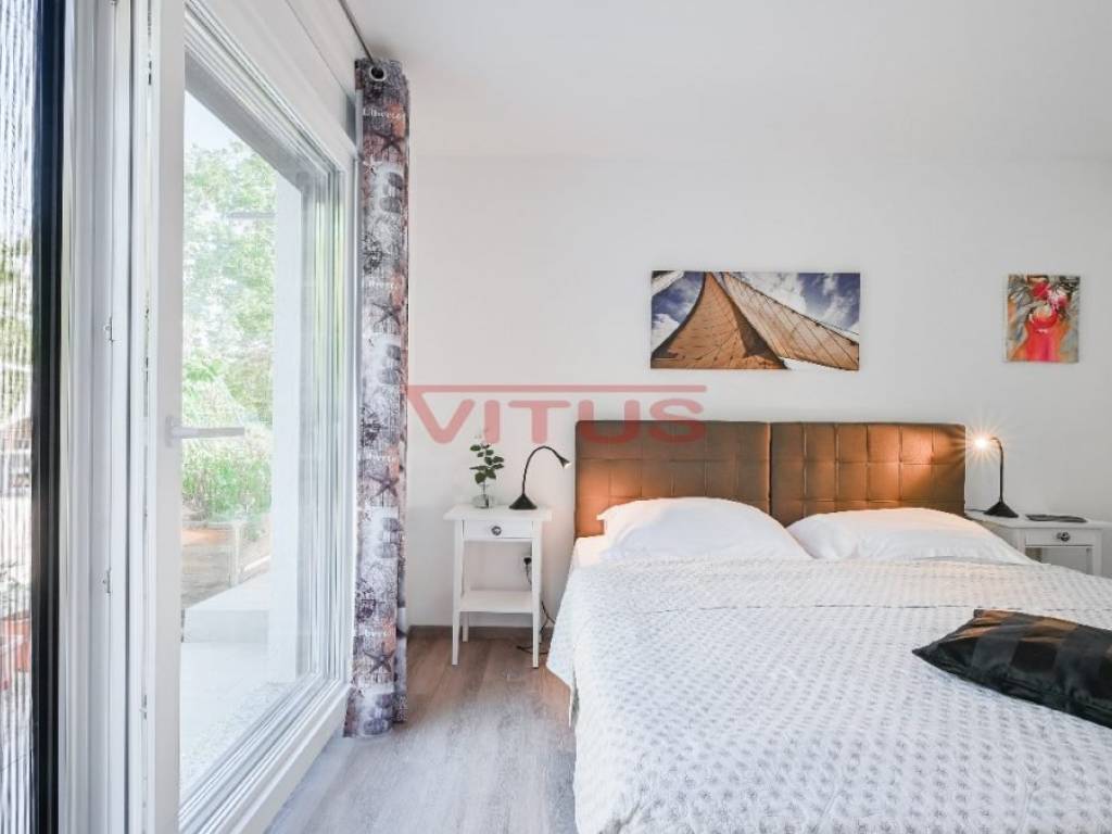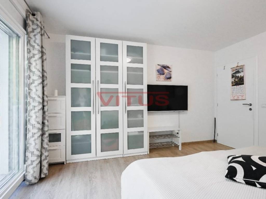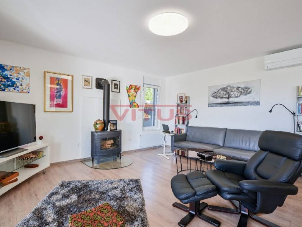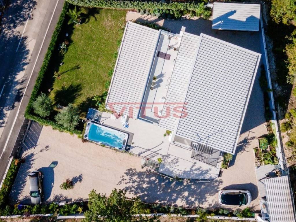 This detached villa of 174 m2 is located in a small village near Malinska. It was built on a plot of 917 m2 which allows peace and privacy, and consists of ground floor and first floor. The ground floor has an open space consisting of a kitchen, dining room and living room, and two bedrooms, two bathrooms and a laundry room. The living room has direct access to a covered terrace with sun deck and swimm-spa pool. First floor is connected by external stairs where are two bedrooms and two bathrooms and a covered terrace with kitchen. In the spacious garden there is a gazebo with barbecue and parking for several cars. The house is decorated with attention to every detail and is sold furnished. It is equipped with modern furniture and appliances, air conditioning, floor coverings and high quality sanitary ware, and has the possibility of wood heating, which makes it an ideal property for a quiet holiday and enjoyment throughout the year. It is located in a quiet area, surrounded by a green belt, 1500 m from the sea.