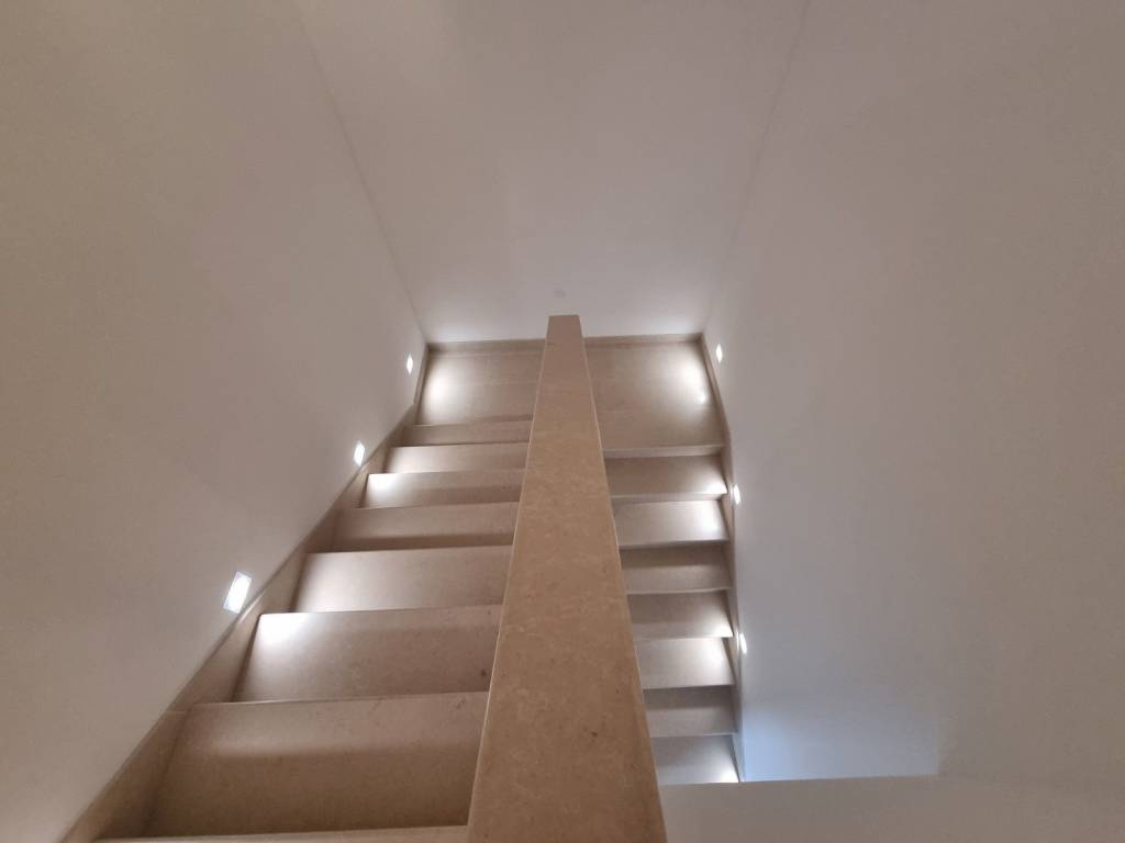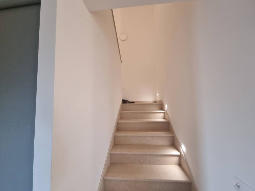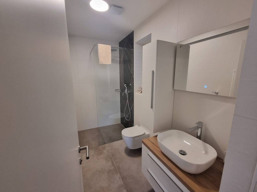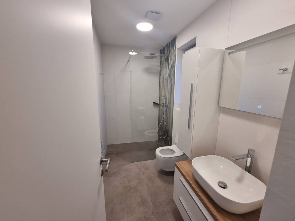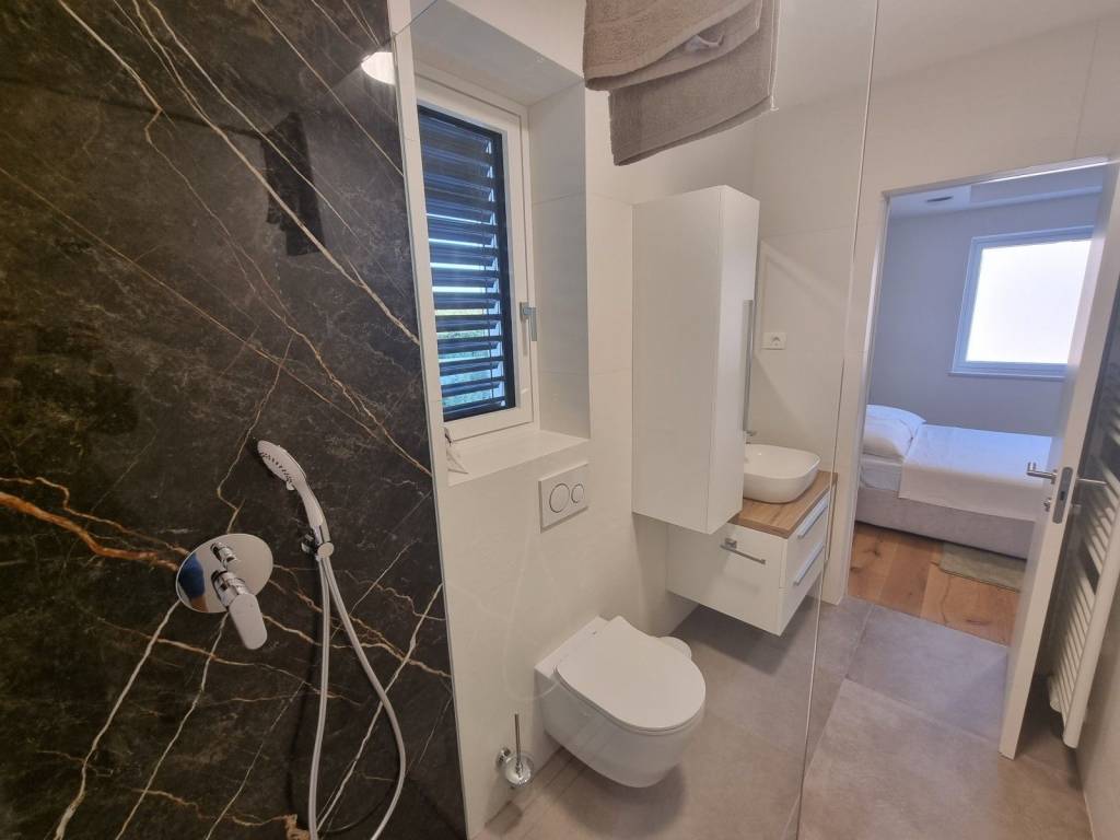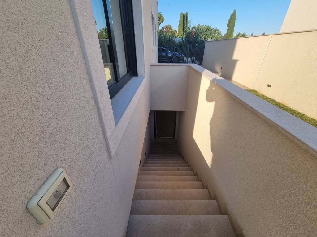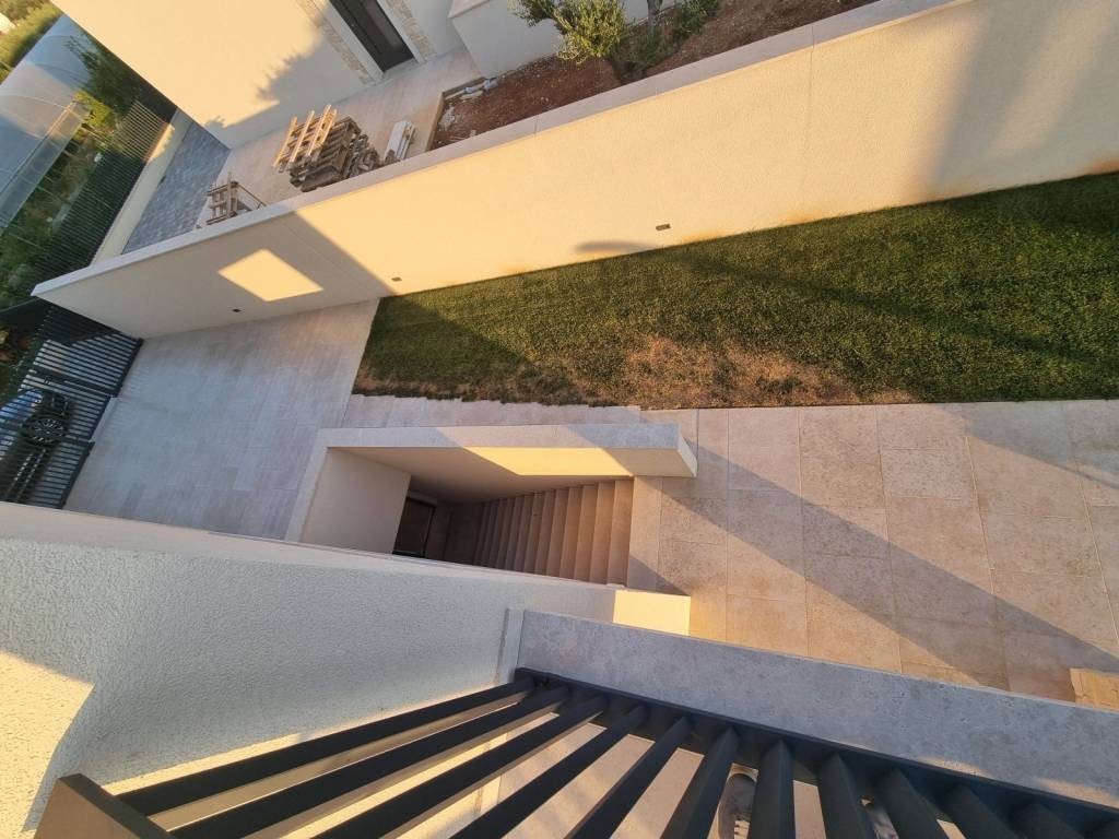 Climb the stairs to the first floor of this modern villa and discover three bedrooms with their own bathrooms, two of which lead to a 21.60m2 terrace with a spectacular view of the sea and olive groves.