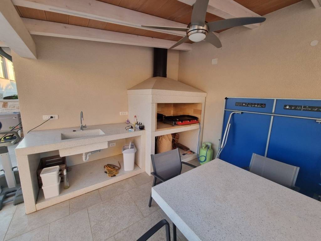 The ground floor consists of a storage room, a guest toilet, a bedroom with its own bathroom, a kitchen with a dining table, and a living room with access to a beautiful covered terrace and a 28m2 heated pool.