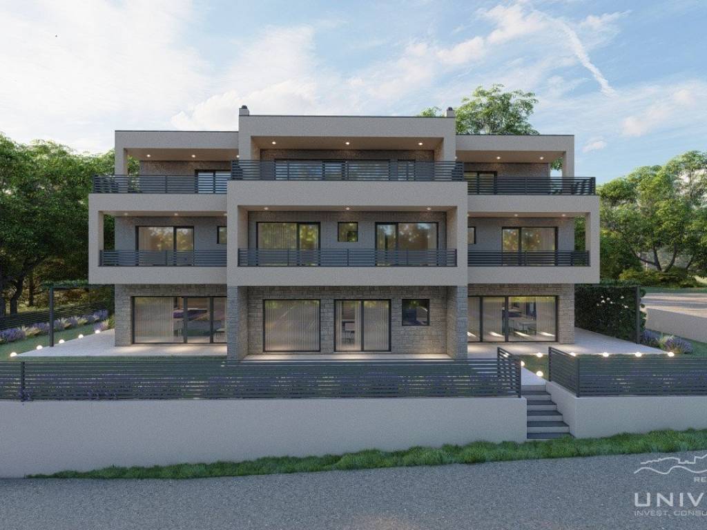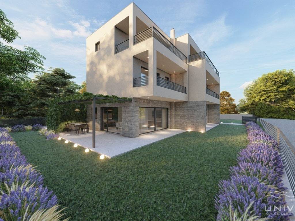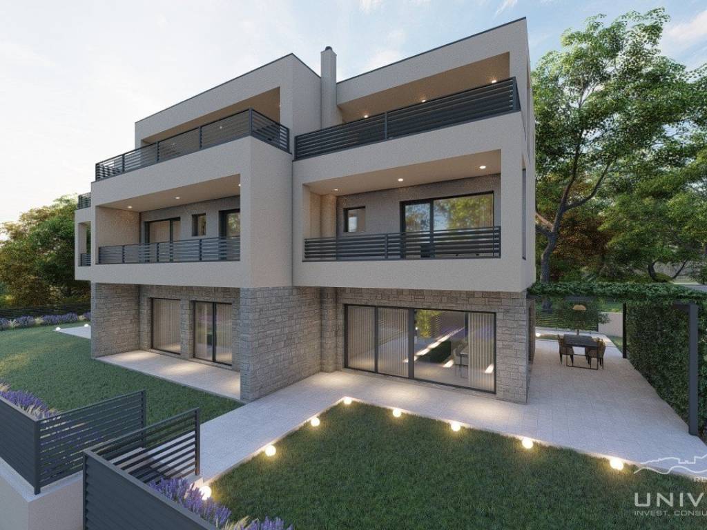 A house for sale is located near Umag, as part of a modern complex of three terraced houses.