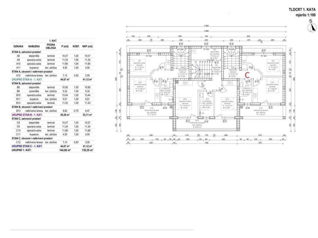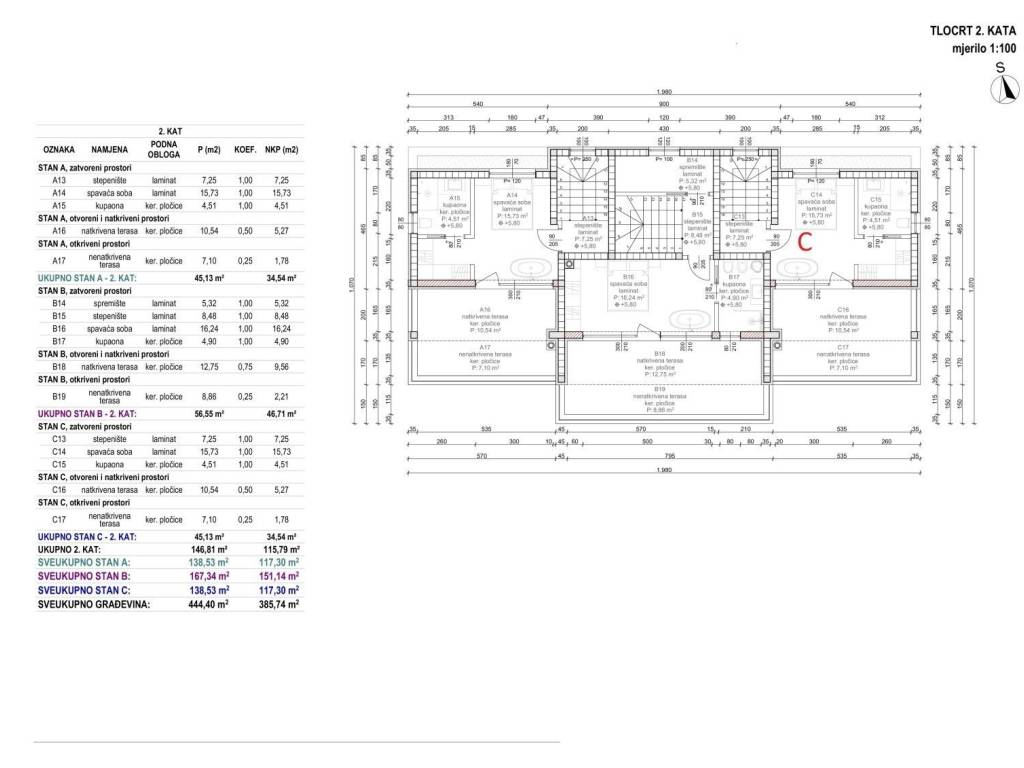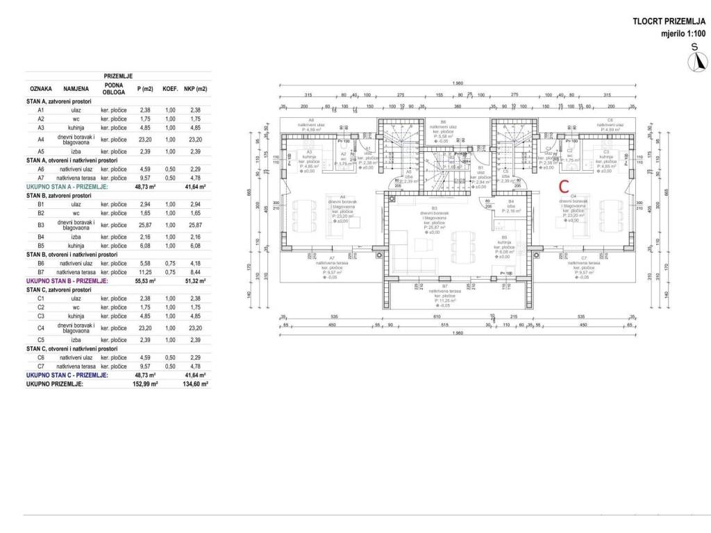 The house for sale is designated as unit B, which covers a total net area of 117m2, which includes a ground floor and two floors.