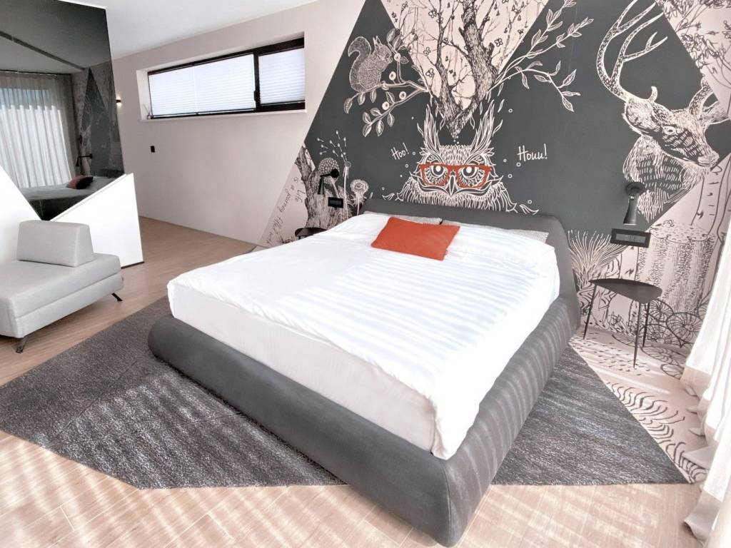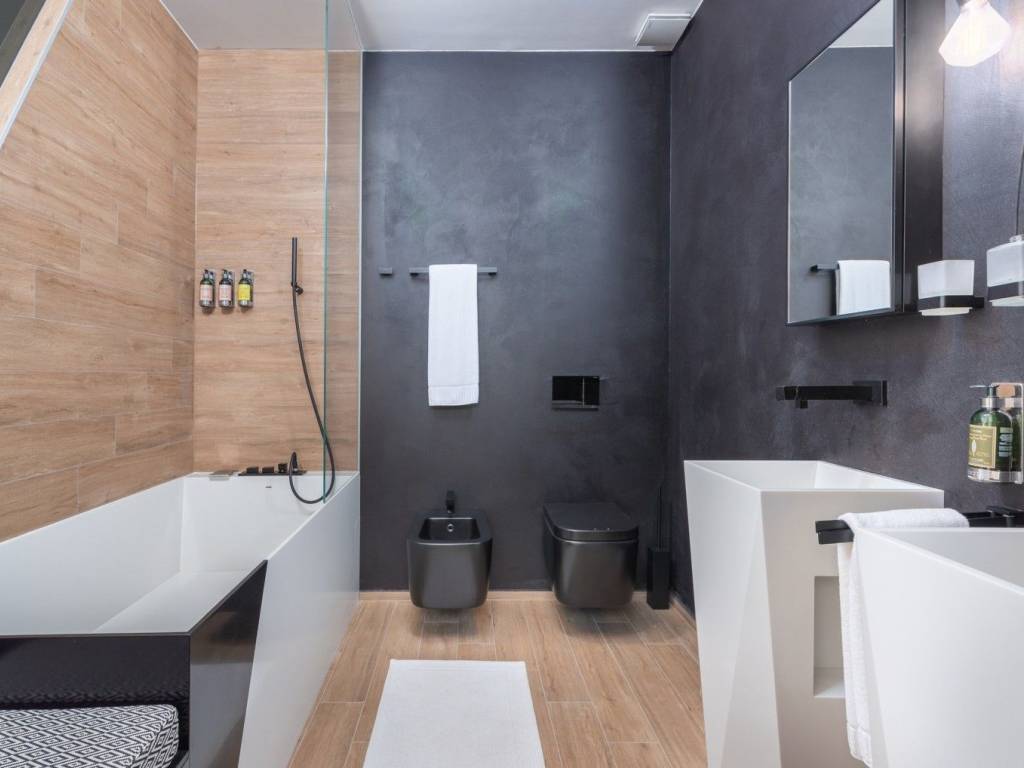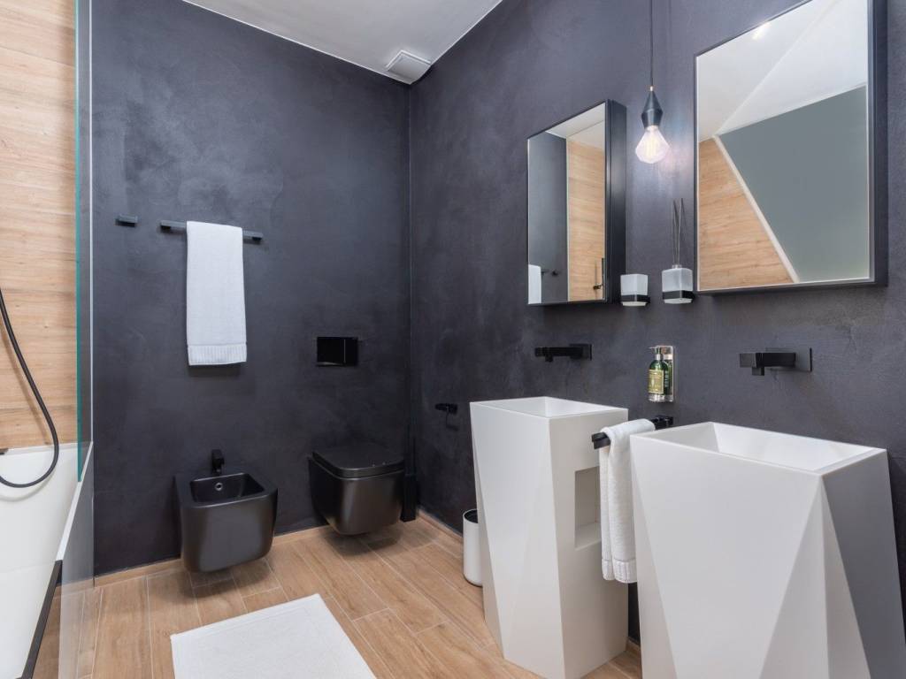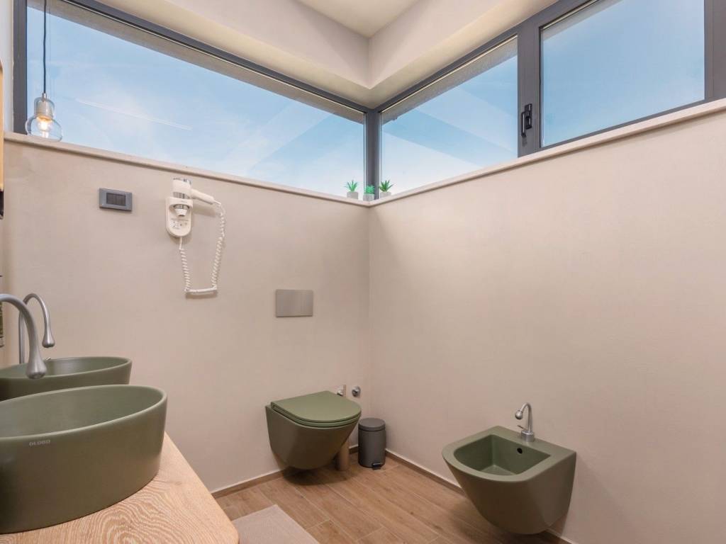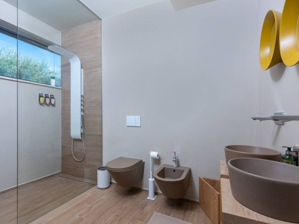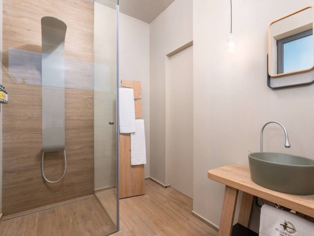 Through the internal stairs we reach the first floor where we are greeted by a relaxation room with an infrared sauna and a jacuzzi, located next to a large glass wall with a mesmerizing sea view. On this floor there are two more bedrooms, each with its own bathroom.