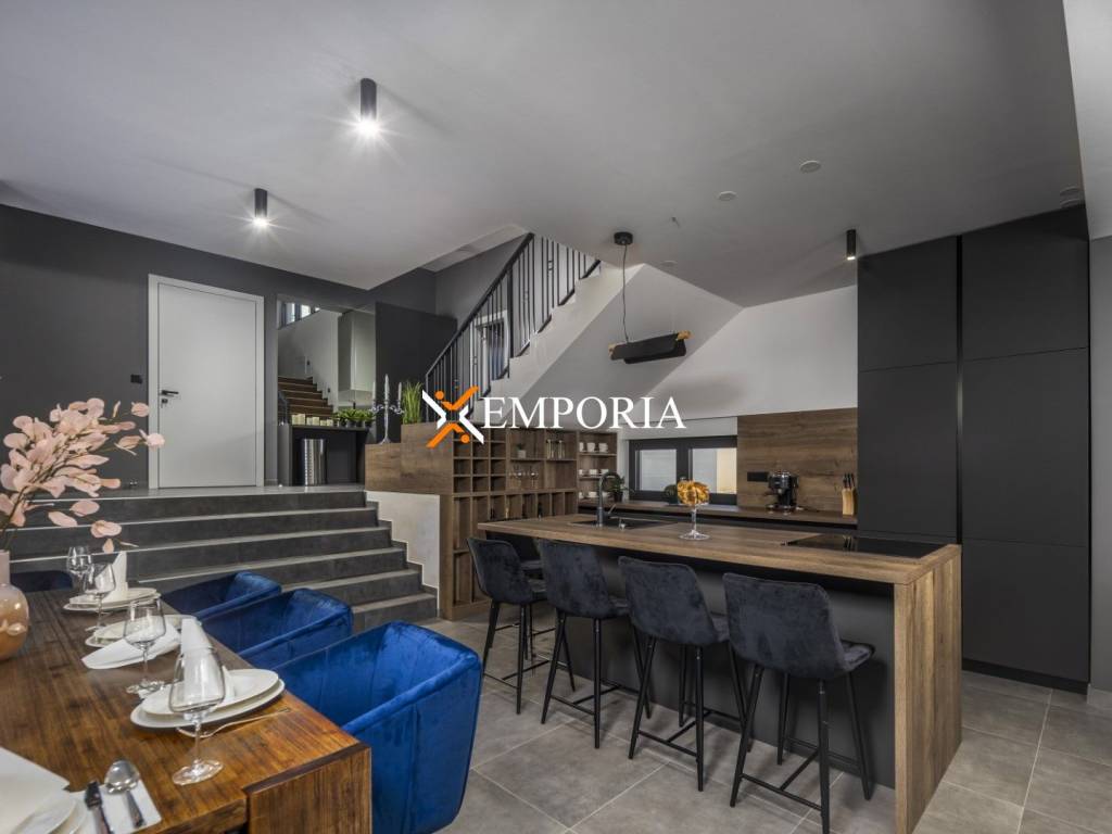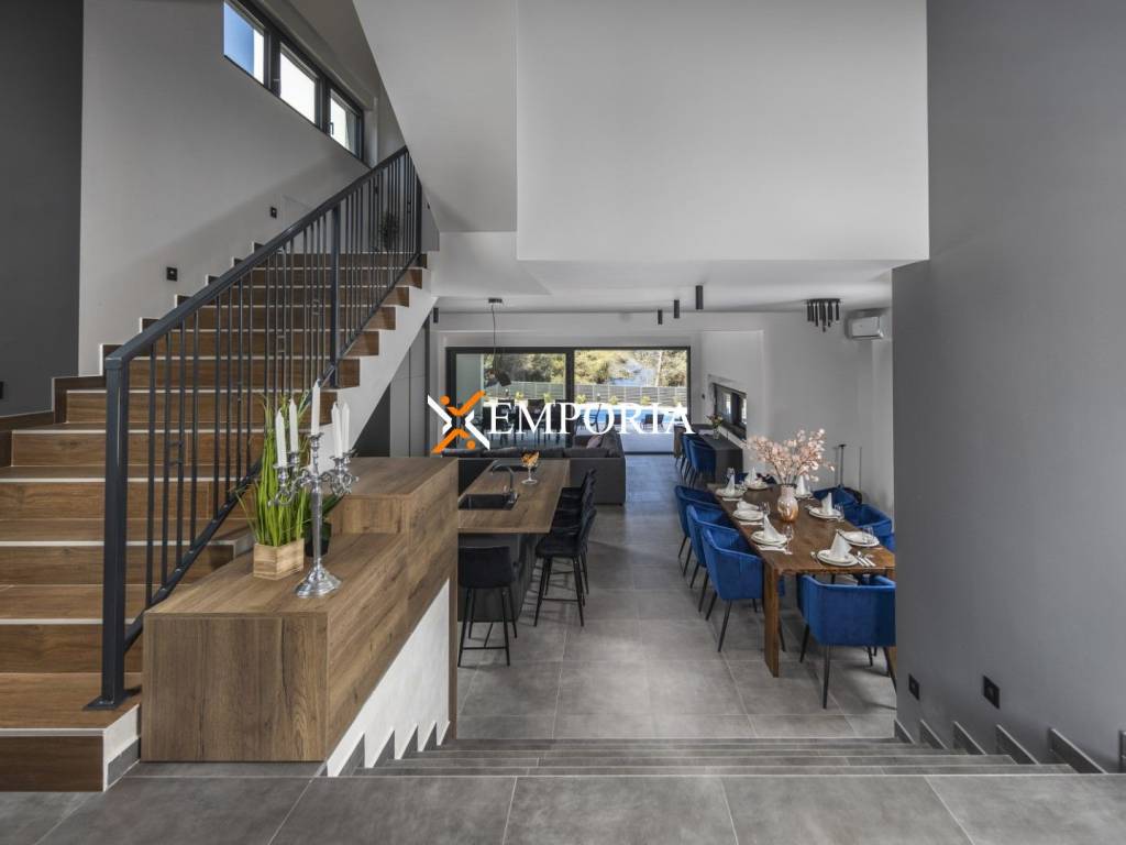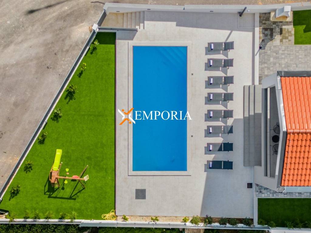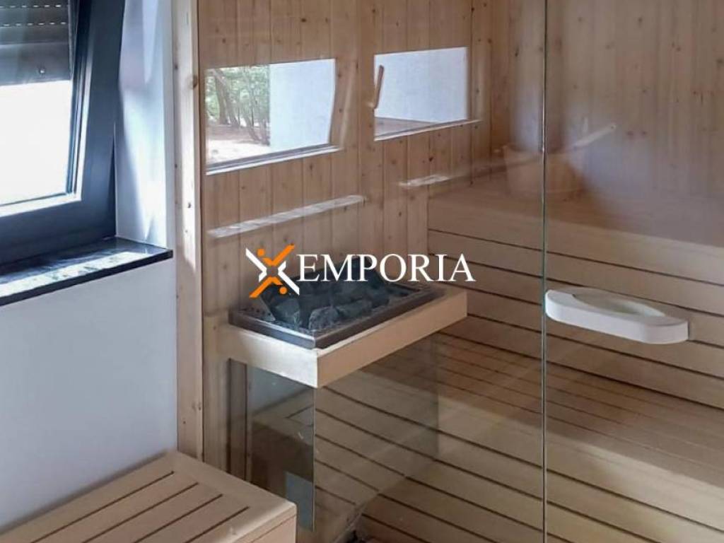 For sale is an extremely beautiful, newly built villa with a swimming pool and sauna, located in the first row to the sea in Pridraga. The sea view from the house is wonderful. It is in a quiet area surrounded by pine trees.