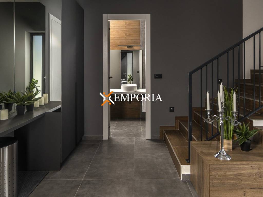 The villa consists of a ground floor and a first floor. On the ground floor there is a hall, a bathroom, a kitchen with a dining room and a living room, a covered terrace, a technical room and a garage. On the first floor there is also a hall, a sauna, four bedrooms, each with its own bathroom, and a loggia.