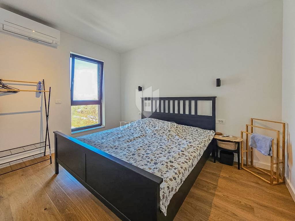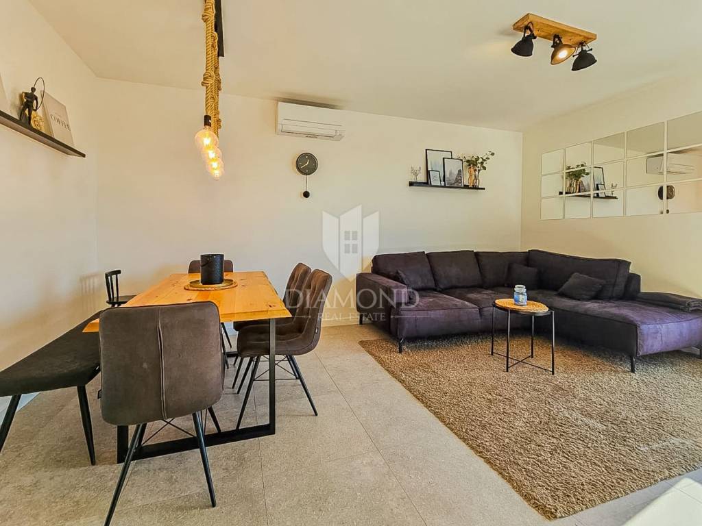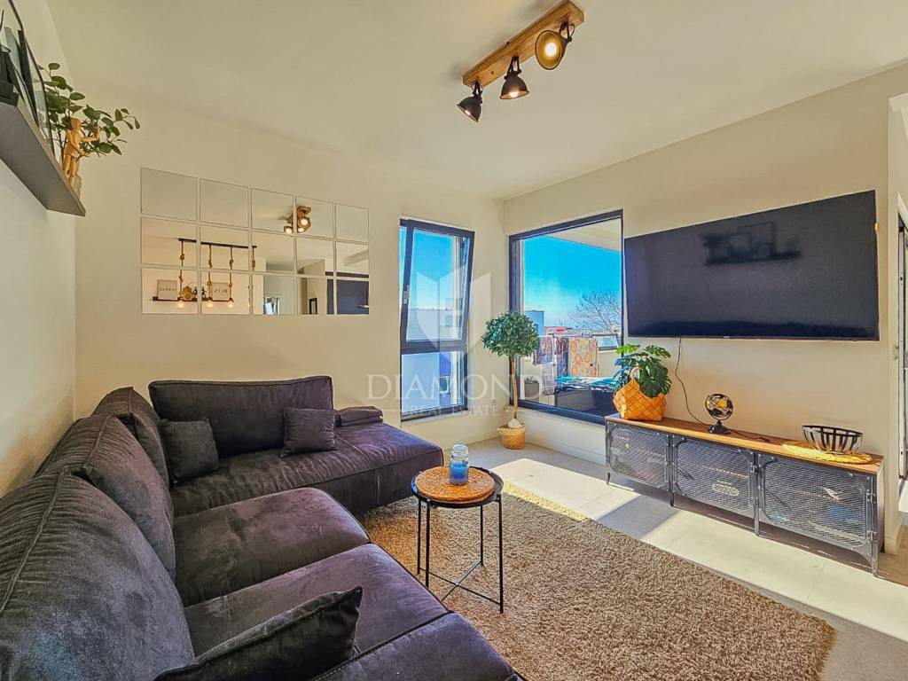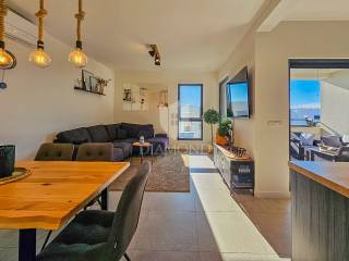 The apartment has a total living area of 70 m² and exudes functionality, light and a feeling of airiness. The open concept of the living room, kitchen and dining room, further emphasized by large glass walls, allows for plenty of natural light throughout the day and creates a pleasant, warm atmosphere. Two comfortable bedrooms provide peace and privacy, while the bathroom and additional toilet are designed in a modern and elegant style. The covered terrace with a partial sea view is the perfect place to relax and enjoy the Mediterranean ambiance. The apartment is fully furnished and equipped with a climate system for heating and cooling and comes with its own parking space and storage room, which further increases the practicality and value of the property.