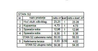 Available is apartment S1, located on the 1st floor of Building 3, with a total area of 54.35 m, featuring a well-organized layout that includes a living room with kitchen and dining area (23.26 m), two bedrooms (12.96 m and 9.38 m), a bathroom (4.73 m), and a covered terrace (8.03 m).