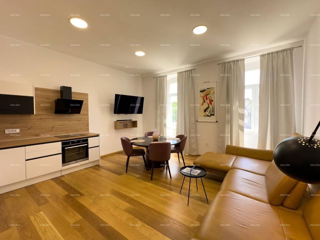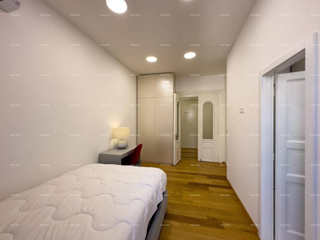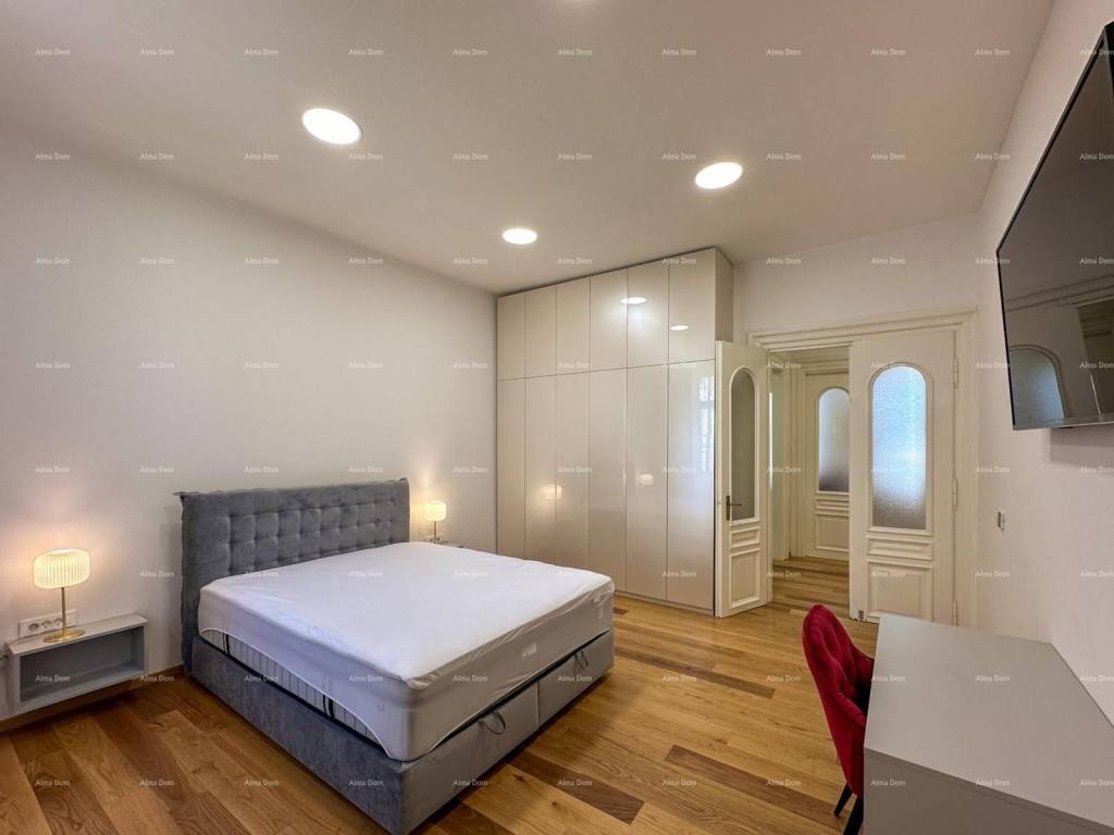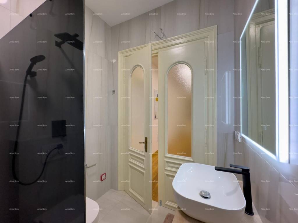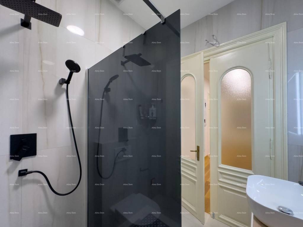 For sale is a beautiful sunny apartment in the center of Pula, on the city market in the center of events, ideal for tourism due to its excellent location. The apartment has high ceilings, large French doors with beautiful borders that give a touch of elegance to the whole apartment. It consists of two bedrooms with 2 bathrooms and a spacious living room and a terrace of 85 m2. The apartment is completely renovated, equipped and ready to move into.