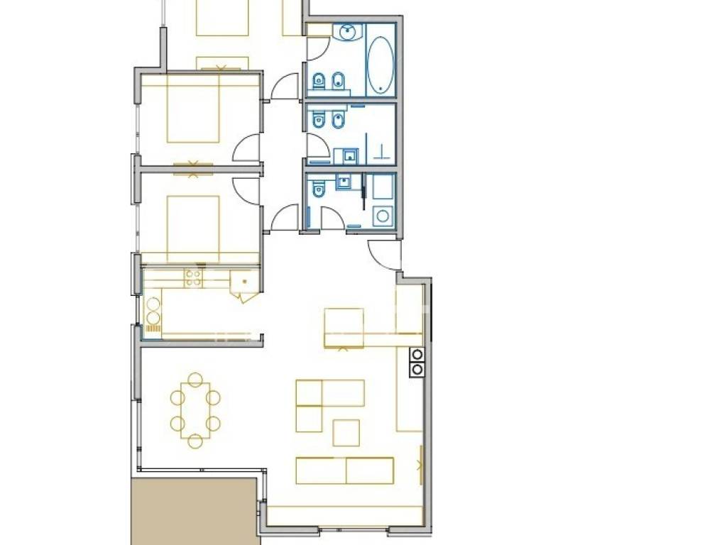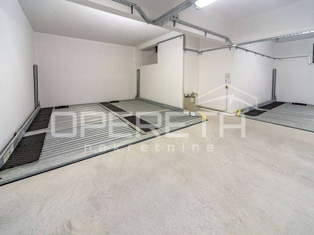 The apartment consists of a hallway, living room, kitchen, wardrobe, three bedrooms, anteroom, two bathrooms, and a guest toilet (total interior area: 120 m). It also includes a 10 m terrace, two private parking spaces (upper and lower level), and a 29 m storage room in the basement total usable area: 158 m.
