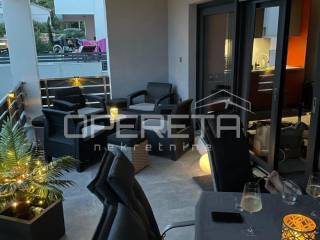 Banjol, island of Rab, apartment for sale 120m2 Apartment for sale in a newer building in Banjol on the island of Rab in excellent condition, top location, large yard. The apartment is located in a quiet location just 100m from a beautiful beach and restaurant. The apartment consists of 3 bedrooms, 2 bathrooms, utility room, large living room connected to the dining room and kitchen. A large glass wall leads to the loggia and terrace. The apartment has 3 parking spaces and a large garden around the building.