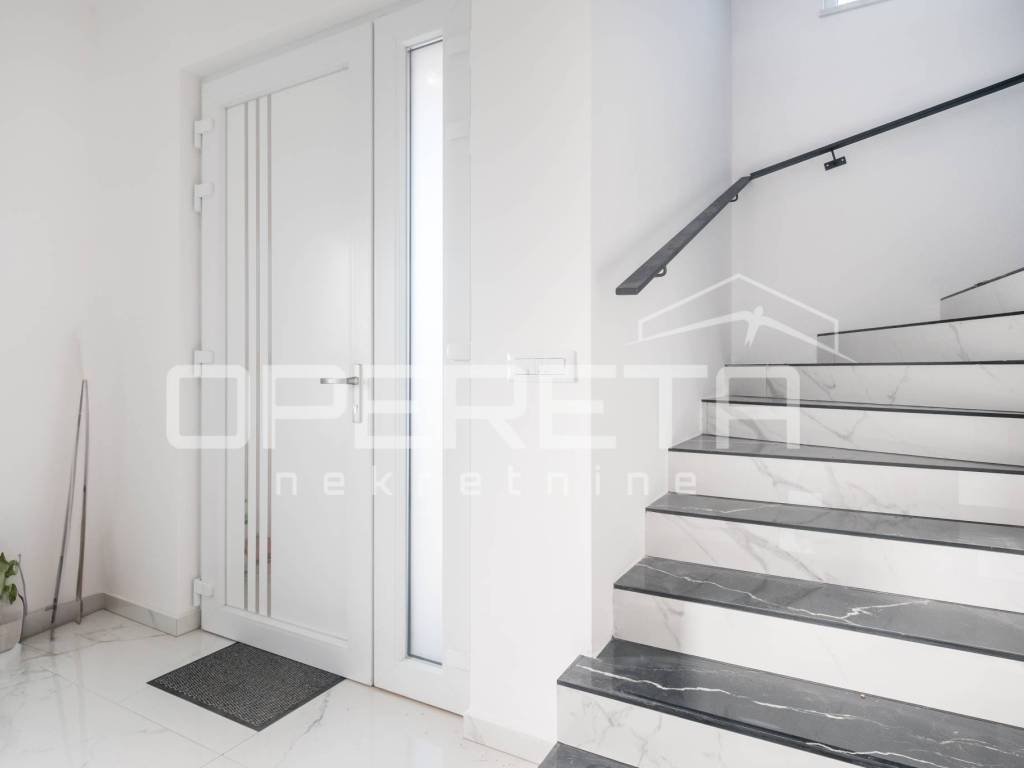 The interior is designed with an emphasis on comfort, with a practical arrangement of rooms and modern details that meet the needs of everyday life. The interior includes a spacious living room, dining room and kitchen space, as well as three bedrooms upstairs, each with its own bathroom. On the ground floor there is also a sauna with an additional shower and a separate toilet for guests, which further contributes to the comfort and thoughtful layout of the space.