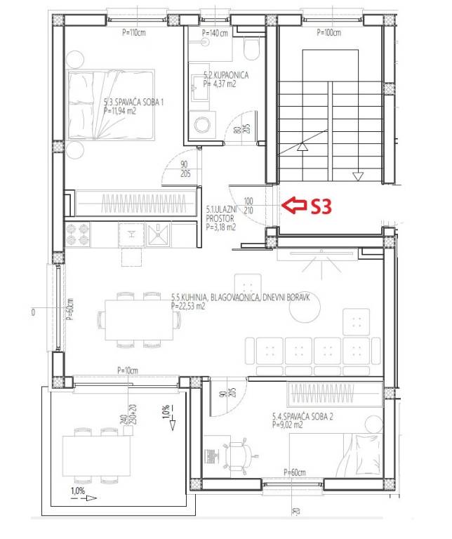 APARTMENT S5 has 63.72 m2 of net usable area including coefficients, and consists of: entrance, 2 bedrooms, bathroom, kitchen and dining room, living room, terrace, and 1 parking space. The price is 185,000 € (Buyer is exempt from paying 3% real estate transfer tax).