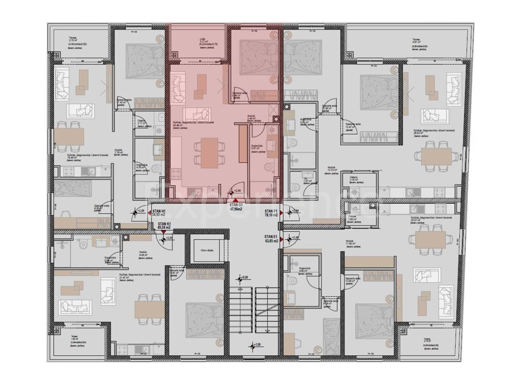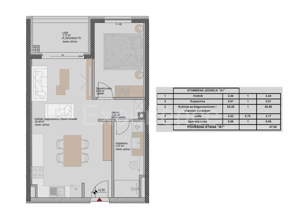 On sale is an apartment with a surface of 47,96 m. The apartment is situated on the first floor of the residential building. Contains: an open and bright space that combines the living room, kitchen and dining room with access to a balcony, bedroom and a bathroom.