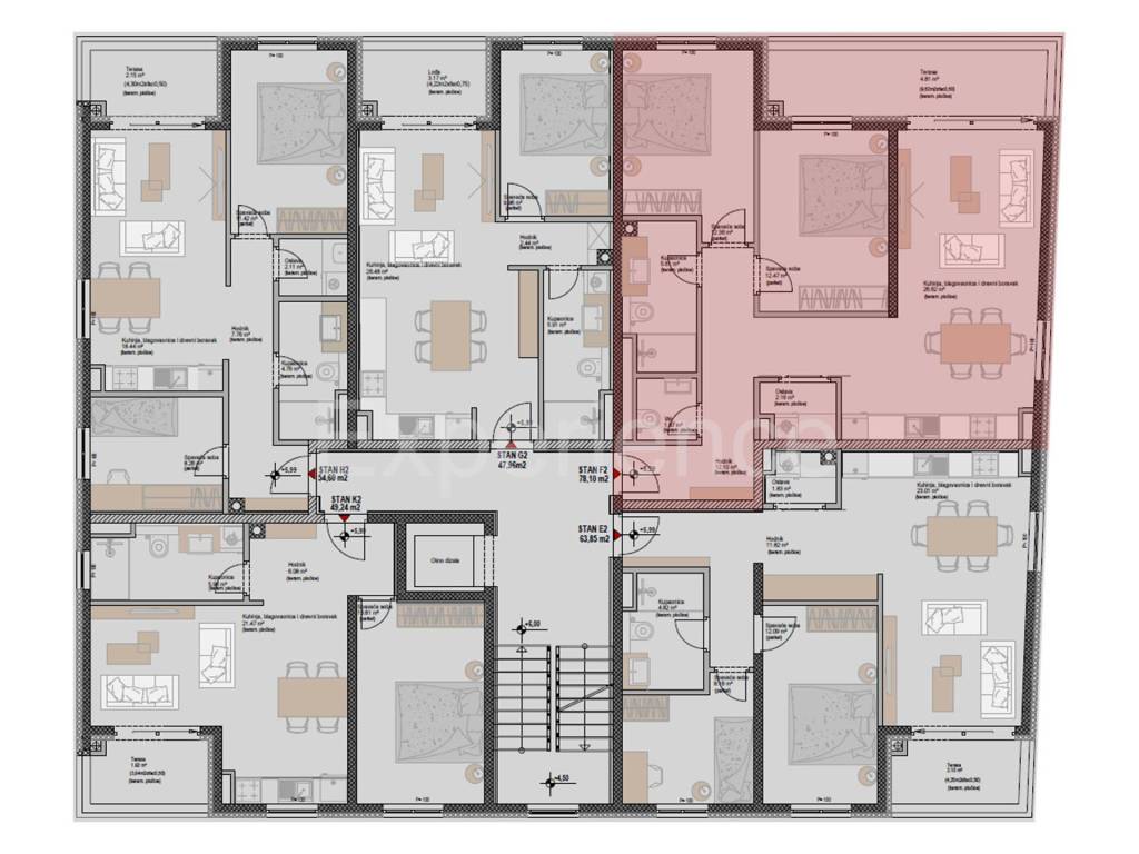 On sale is an apartment with a surface of 78,10 m. The apartment is situated on the second floor of the residential building. Contains: entrance hall, an open and bright space that combines the living room, kitchen and dining room with access to the spacious covered terrace (9,62 m), two bedrooms, bathroom, toilet and storage room.