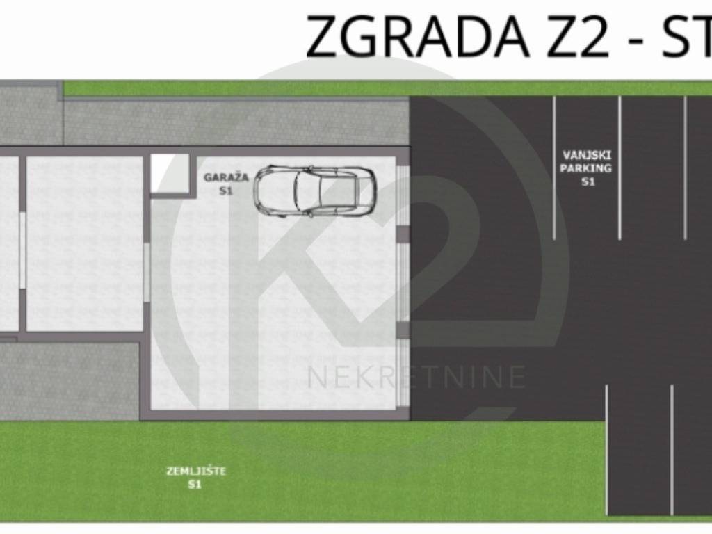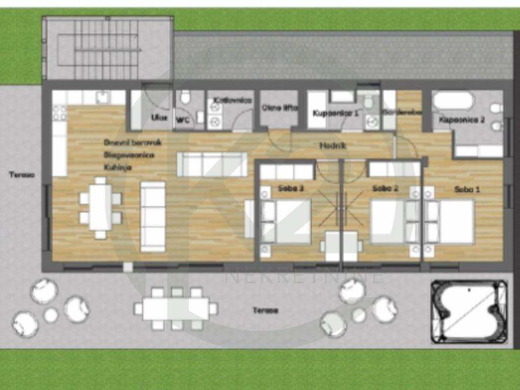 Stanu pripada i dizalo, garažno parkirno mjesto i vanjsko parkirno mjesto, tehnički podrum, vanjsko stubište, nenatkrivena terasa i natkrivena terasa.
