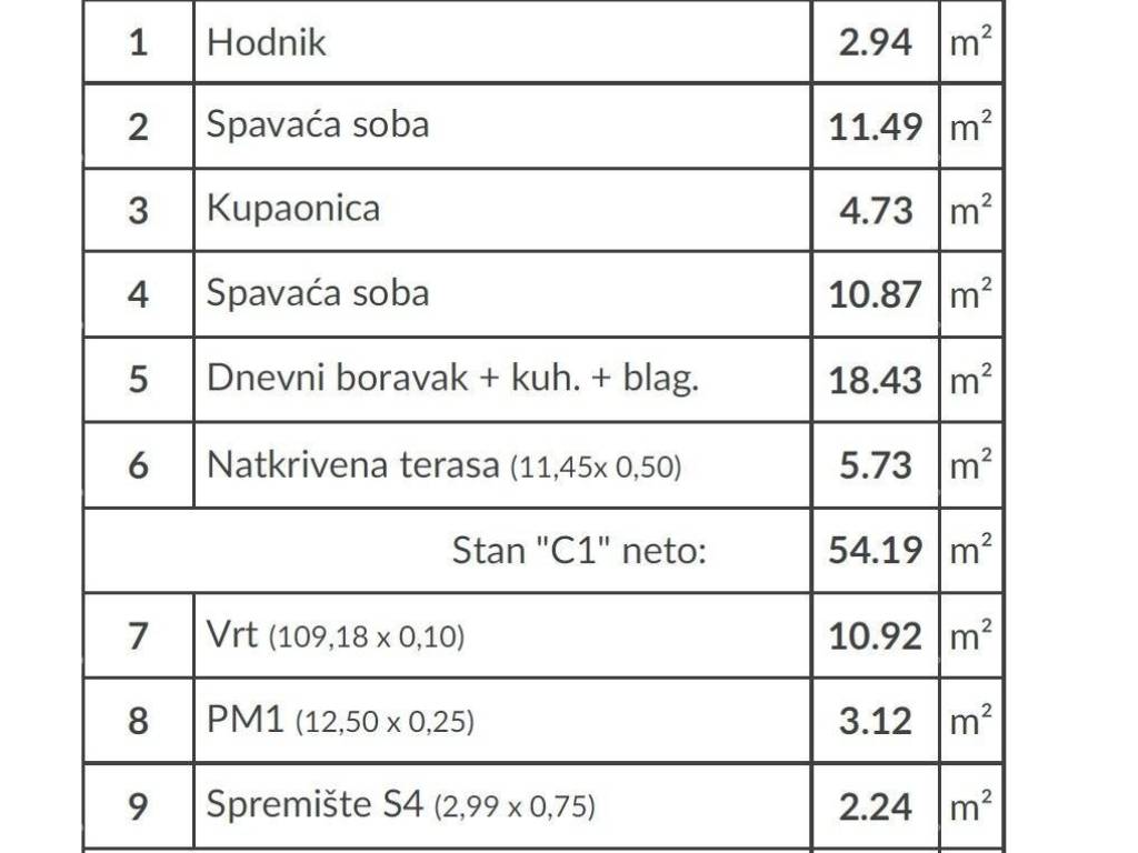 EXTERNAL AND ADDITIONAL SPACES Garden: 109.18 m (calculated 10.92 m) Parking space PM1: 12.50 m (calculated 3.12 m) Storage S4: 2.99 m (calculated 2.24 m)