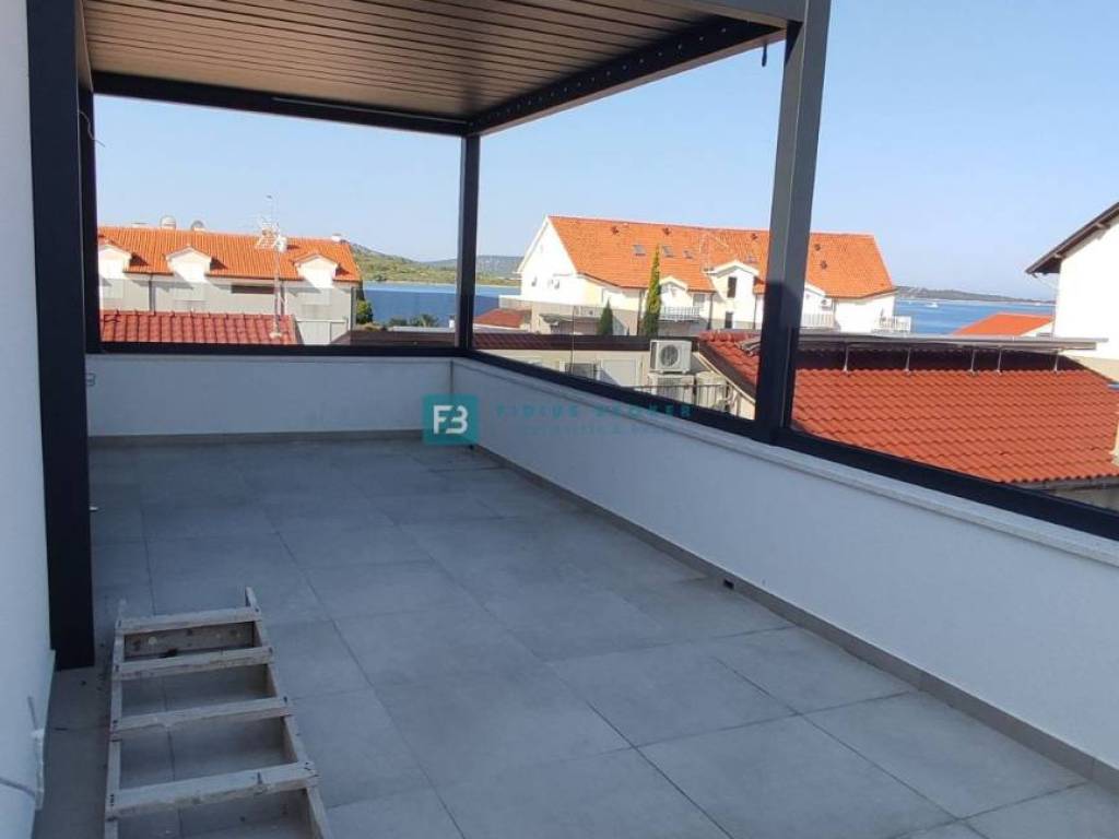 House S2 with a net usable area of 168.42 m2 (living area 121.51 m2 + terrace 46.91 m2 + garden + 2 parking spaces) consists of three floors: ground floor + 1st floor + 2nd floor. On the ground floor of the house there is an entrance area, a storage room, a laundry room, a toilet, an open space kitchen with a dining room and a living room that has access to a spacious terrace of 18.75 m2. An internal staircase leads to the 1st floor where there is a hallway, two bedrooms, each with its own bathroom and a shared terrace. On the 2nd floor there is a hallway, a bathroom, a bedroom with access to a terrace of 17.31 m2 with a beautiful view of the sea. The house has an appropriate part of the garden and two parking spaces. The house is modernly decorated with attention to every detail, and is for sale fully furnished and equipped and as such is immediately move-in ready. The price is €495,000.