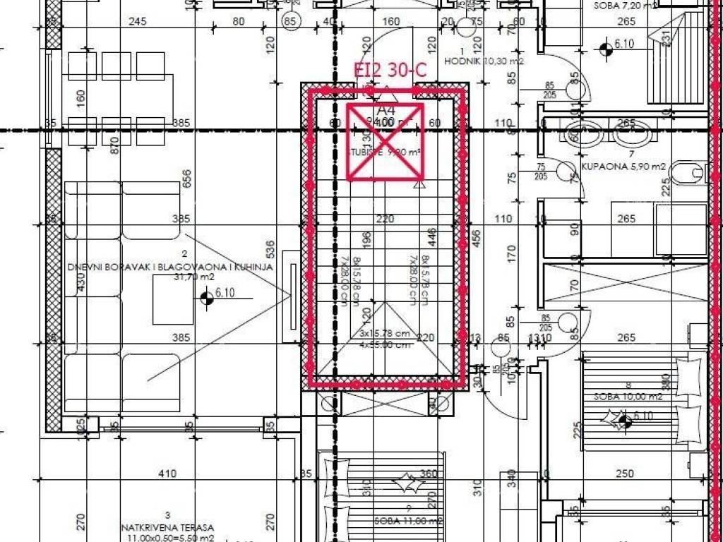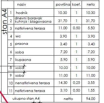Apartment A4, with an area of 94 m2, is located on the second floor and consists of: