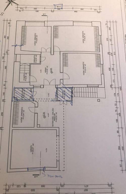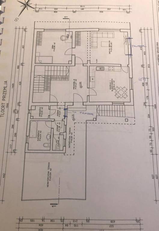 1 kat; hodnik, predsoblje, kupaonica, 4 sobe i natkrivena terasa, te neuređeno potkrovlje.