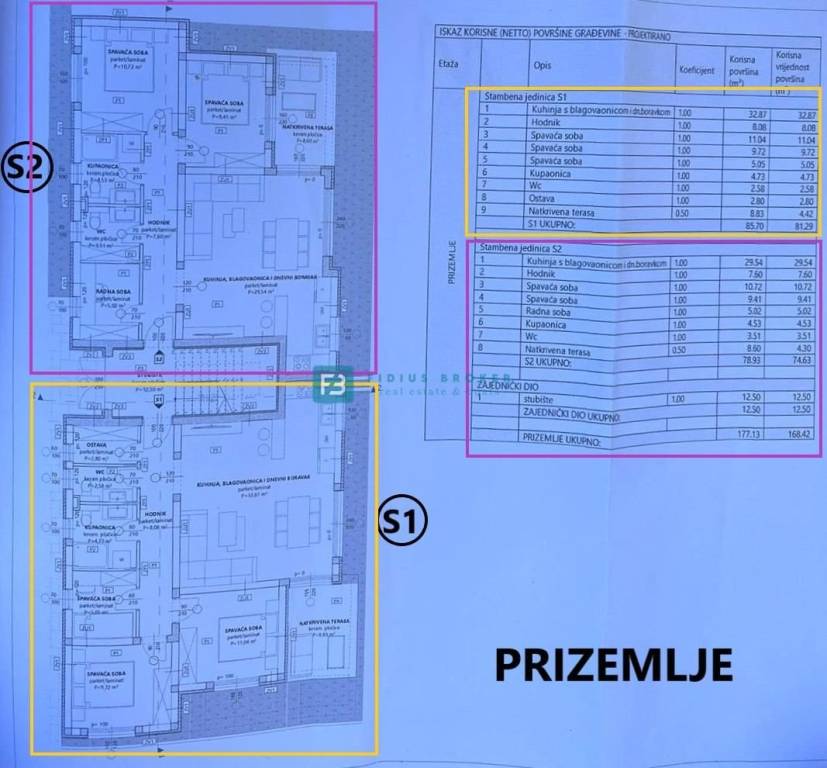 Apartment S1 with a total usable area of ​​81.29 m2 + garden of 51.23 m2 is located on the ground floor. The apartment is south-facing and consists of a hallway, toilet, storage room, bathroom, three bedrooms, kitchen with dining room, and a comfortable living room with access to a covered terrace of 8.83 m2. The apartment also has a garden of 51.23 m2 surrounding the apartment and terrace, and one outdoor parking space in front of the building. The price is €225,000.