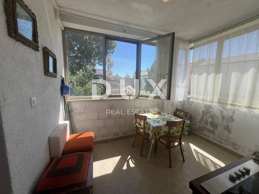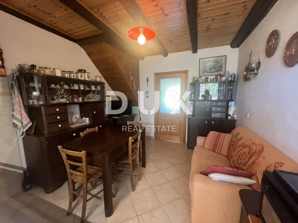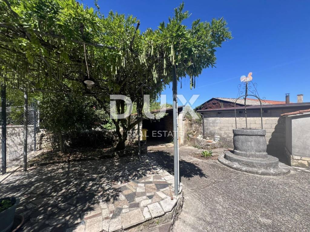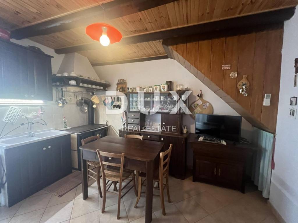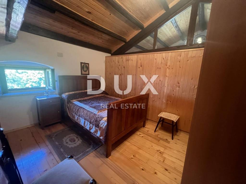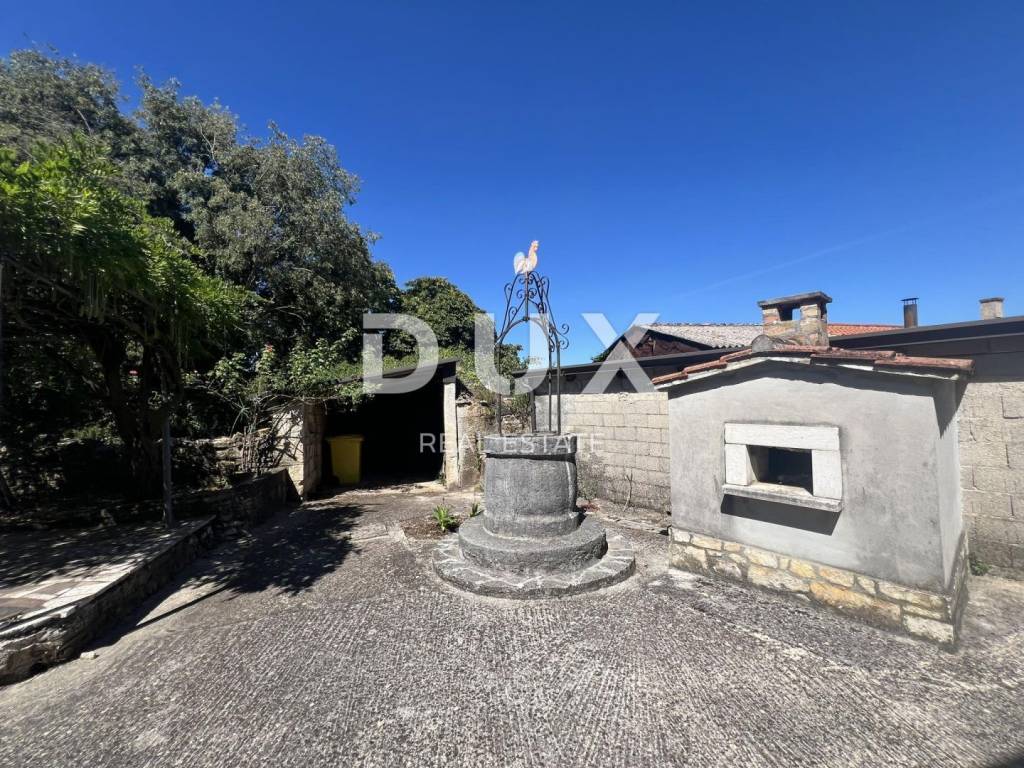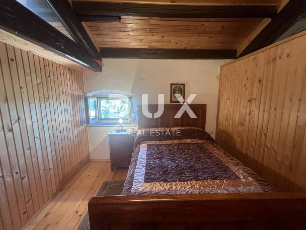 A beautiful stone house is for sale. It has a large garden with several parking spaces, covered and uncovered. In the courtyard there is an old well and a bread oven. On the ground floor there is a garage, a tavern and a storage room. On the first floor there is a covered terrace, a large bedroom, a living room with a kitchen, a dining room and a large bathroom. There are two spacious bedrooms on the high attic. The house is furnished and is being sold as such.