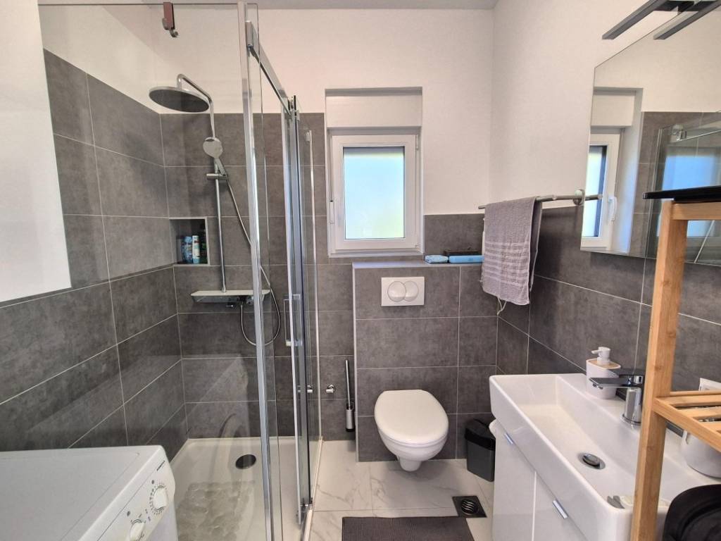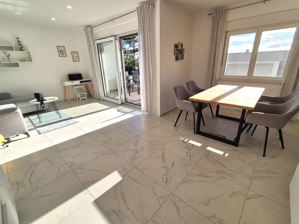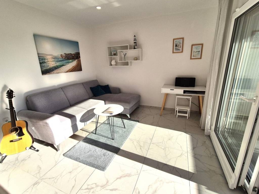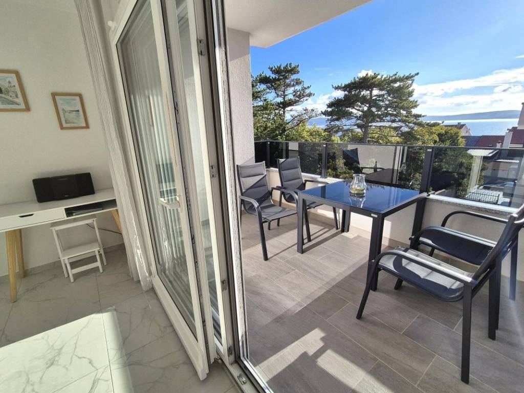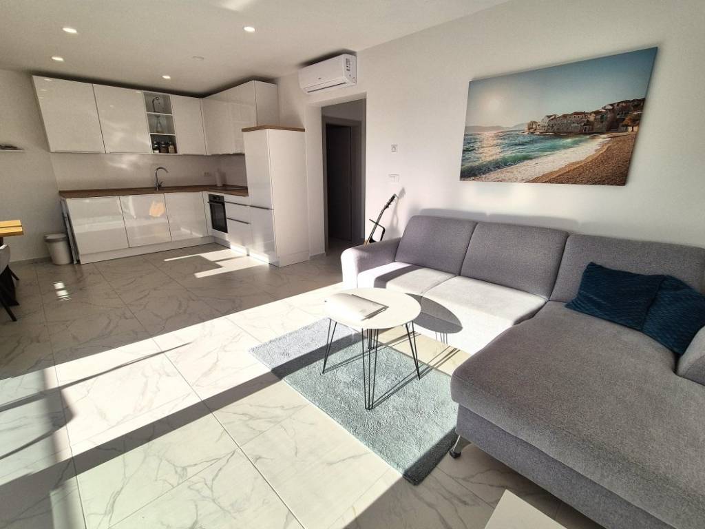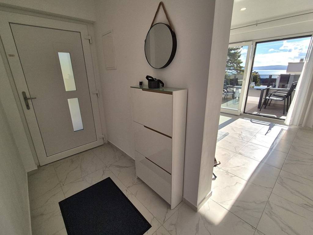 The apartment has a separate entrance and consists of an entrance hall, bathroom, separate toilet, two bedrooms, kitchen with dining room and living room and a loggia with a sea view.