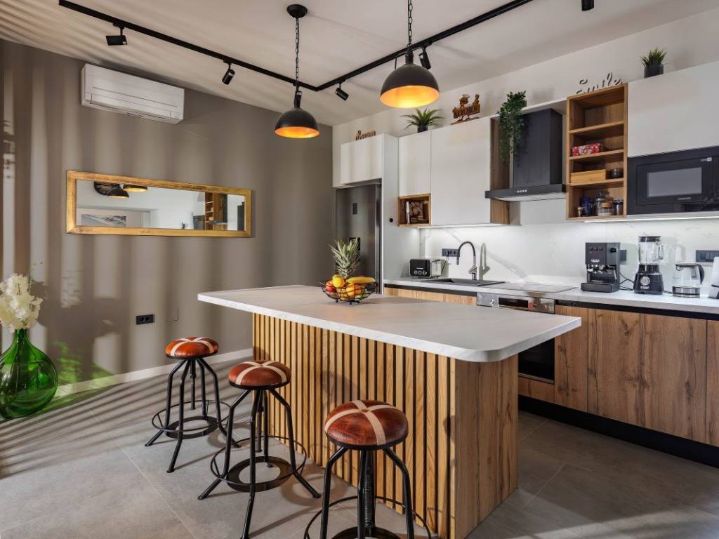 It consists of a living room, in the continuation of which there is a kitchen with an island and a dining room, four bedrooms with en suite bathrooms and a guest toilet. The interior is uniquely and impeccably decorated.