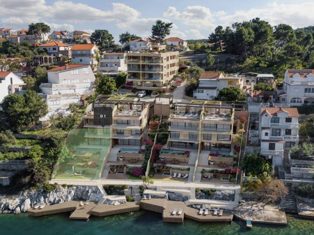 A first row to the sea apartment, with crystal clear sea literally on your doorstep, is a rare privilege offered by this unique apartment in Okrug Donji. Located in a quiet location, in the immediate vicinity of Trogir and Split and only 13 kilometers from the airport, it is an ideal choice for those looking for a luxury property in an authentic Mediterranean environment.