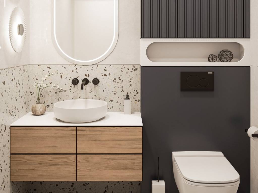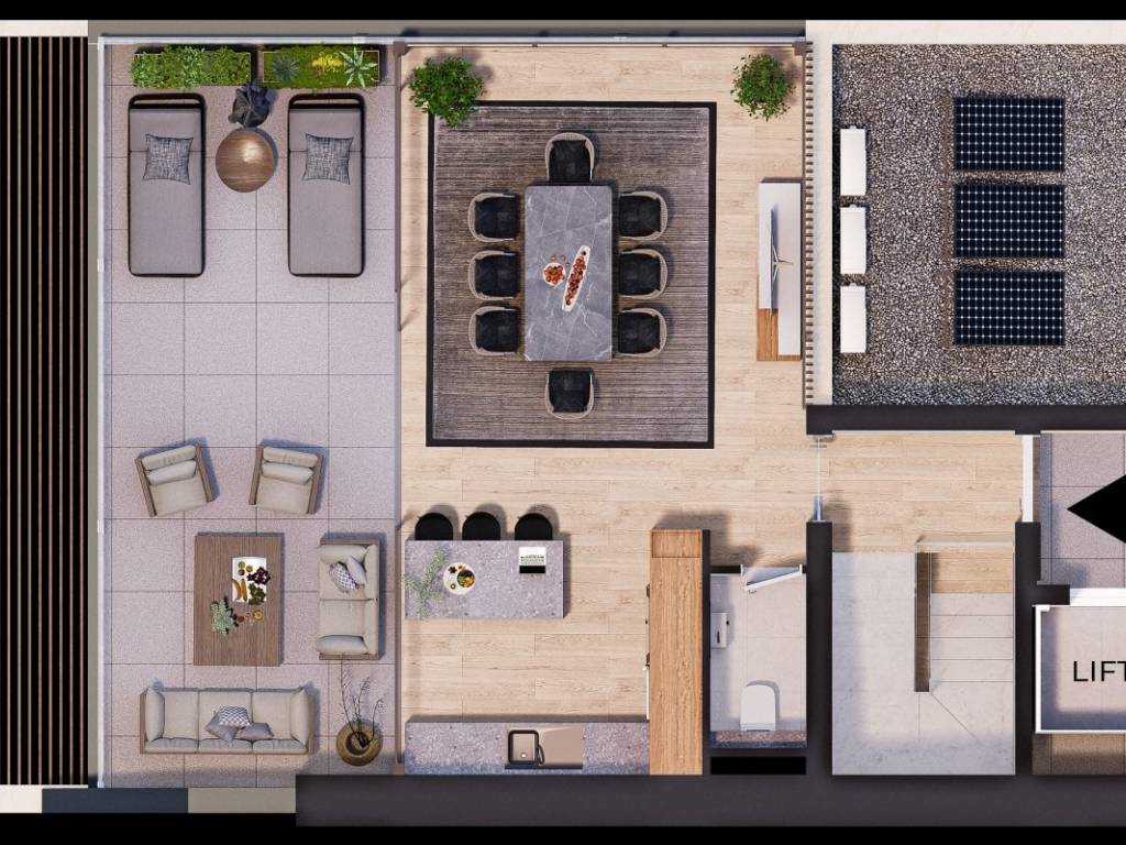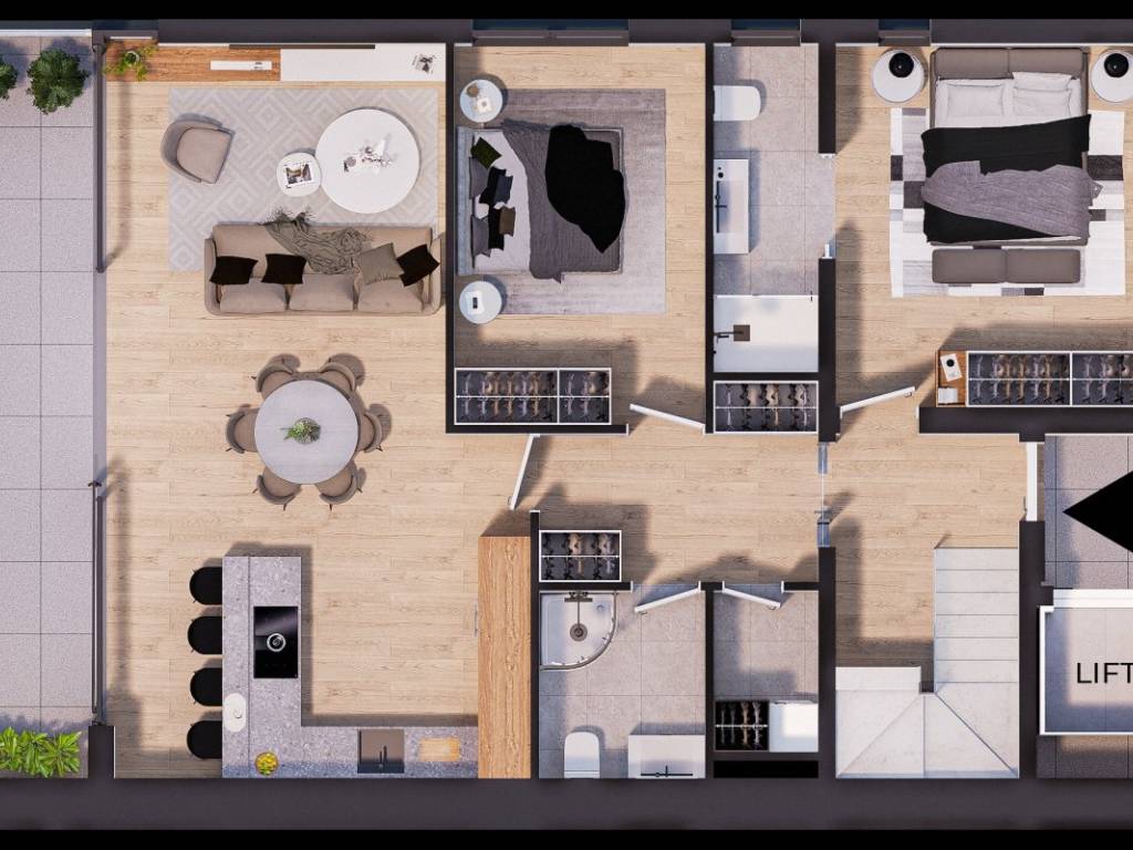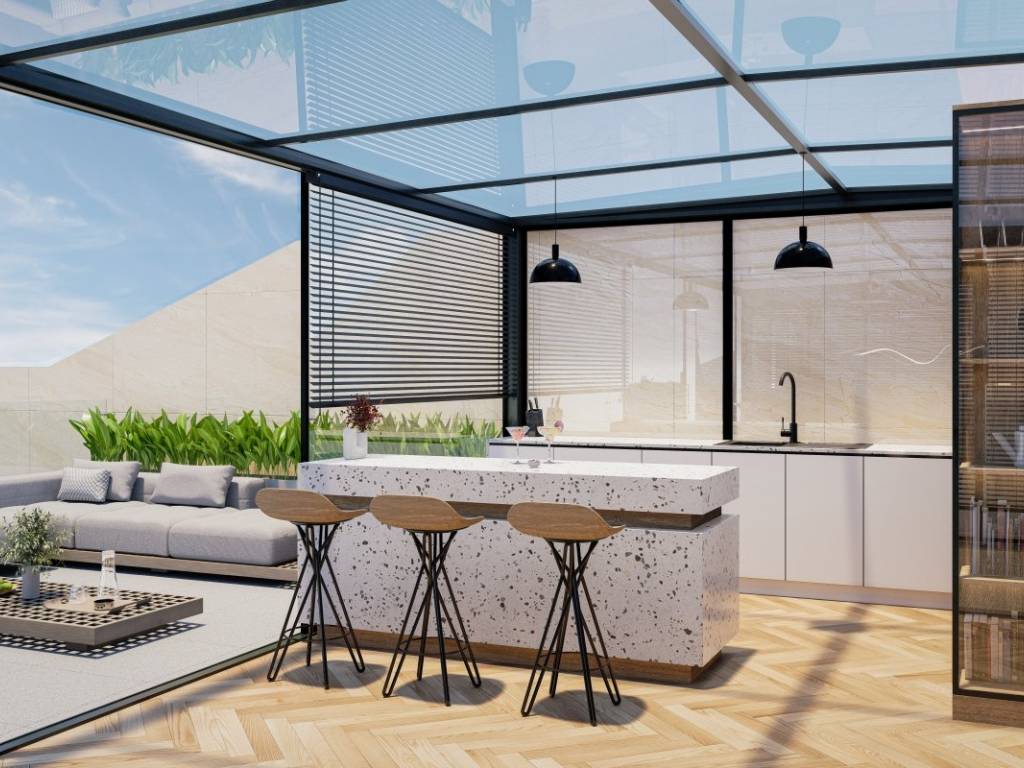 The biggest advantage of the apartment is its outdoor space of 79,74 m, which creates the impression of privacy and provides all the amenities of a private house. Only a few steps separate the owner from a landscaped sunbathing area on the coast, and of the additional amenities located in the building behind, the most notable is the shared roof terrace with lounge seats and an open view of the sea, a gym and saunas in the basement and a swimming pool that is for the common use of all residents.