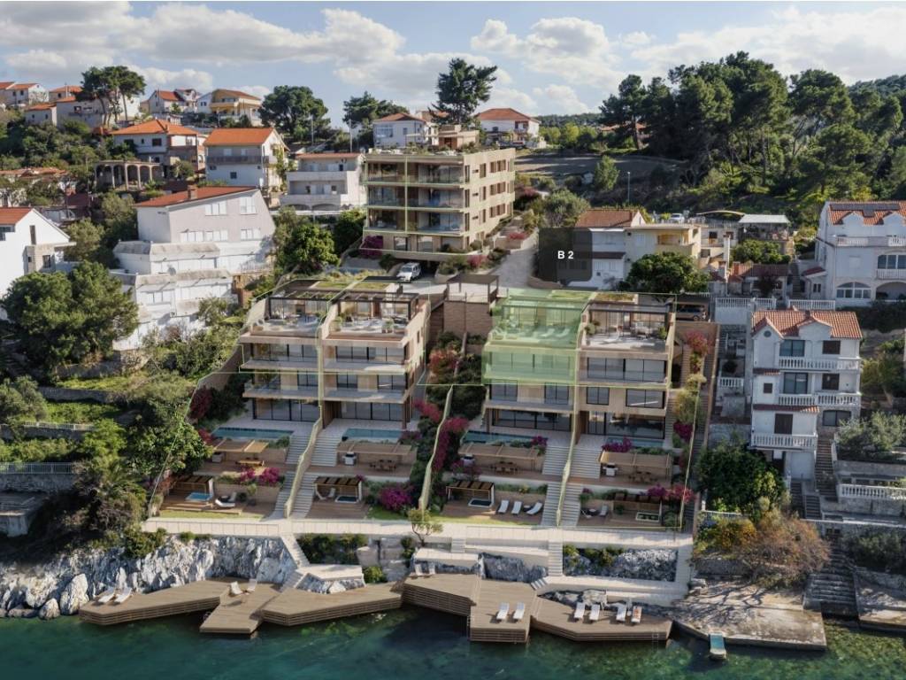 The prime location is characterized by the distance to the airport of only 13 km, the proximity of all amenities on the island and the cities of Trogir and Split. The immediate proximity to the sea, the crystal clear sea and the surrounding nature make this location an ideal place to relax all year round. Considering the numerous terraces, gardens and amenities, the apartment is an excellent choice for all those looking for a property in a prime location, in the first row to the sea.
