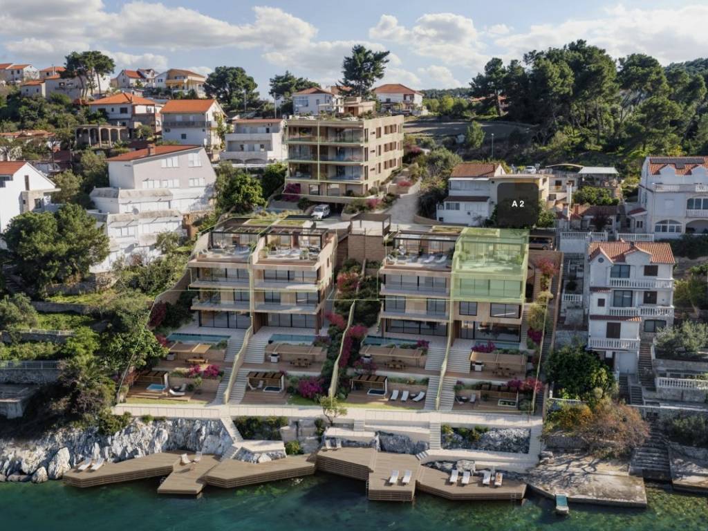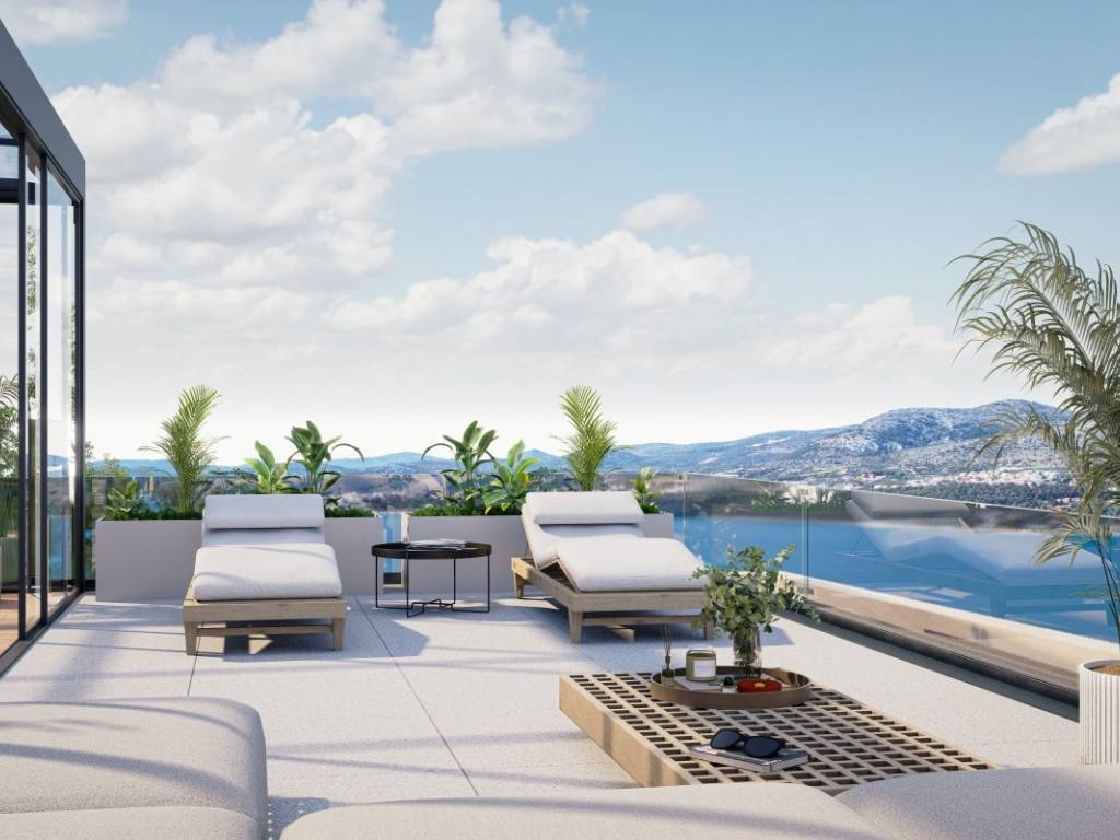 An extraordinary penthouse apartment in Okrug Donji in the first row to the sea that combines luxury and comfort into one extends over 97,86 m of internal area, while its additional value is given by an impressive 75,08 m of external space. Situated in a prime location, the apartment offers direct access to a landscaped sundeck and views that open in all directions to the north, south and west.