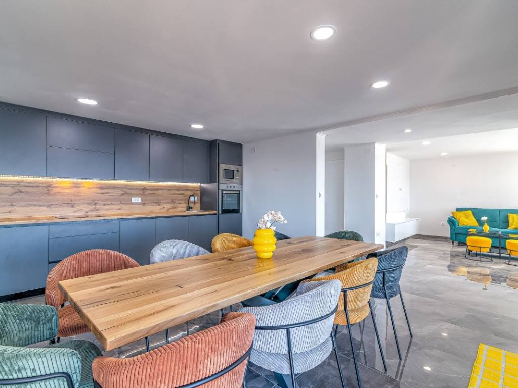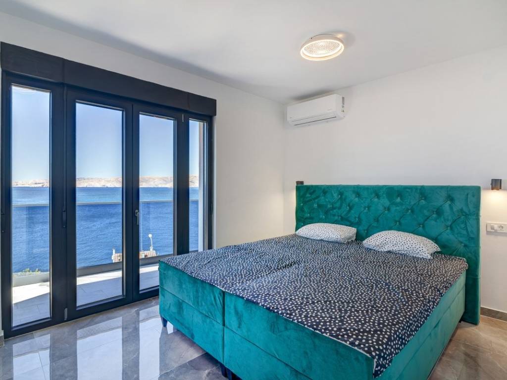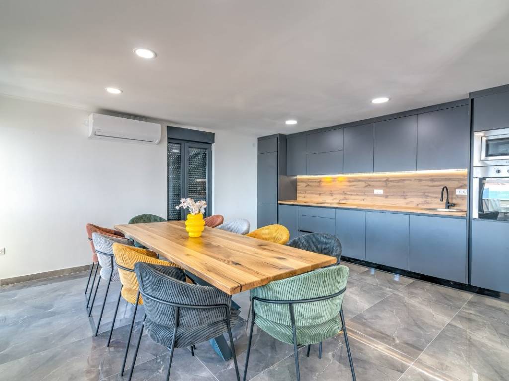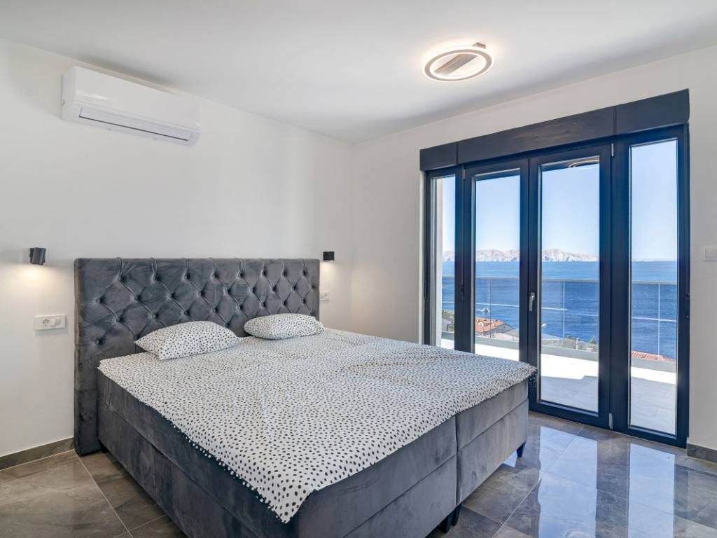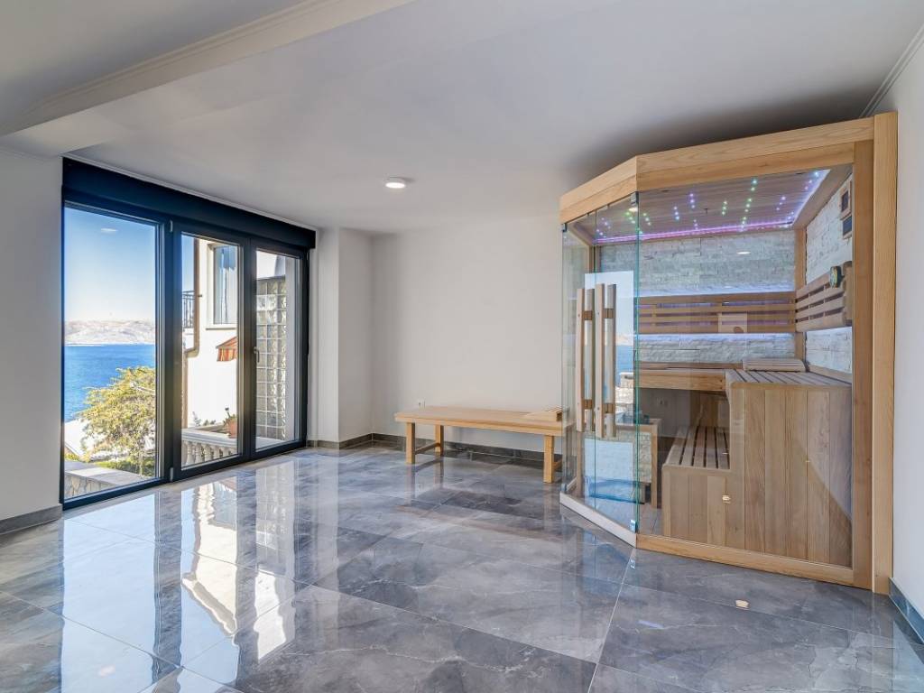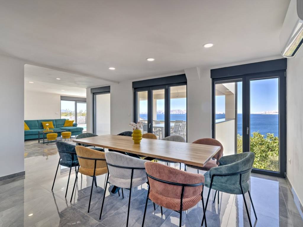 The ground floor and the first floor are designed to function together. The ground floor has a spacious living room and a luxurious dining room with a modern kitchen with clean lines and a modern bathroom. Thanks to the large glass walls, the entire space is bathed in natural light and is enhanced by a panoramic view of the sea and islands.