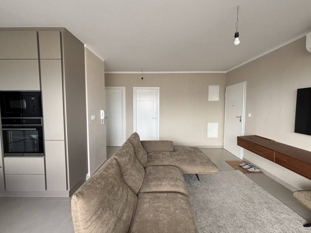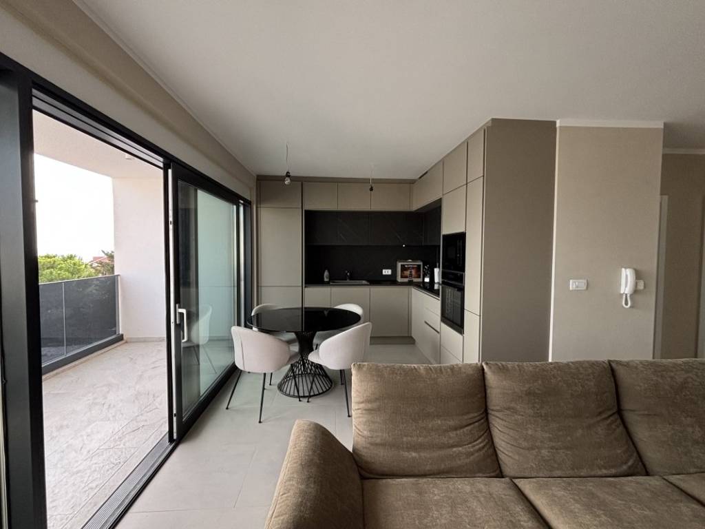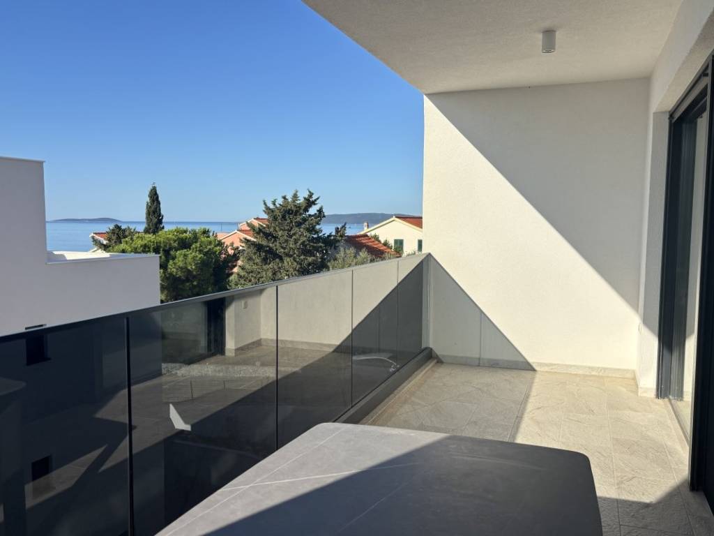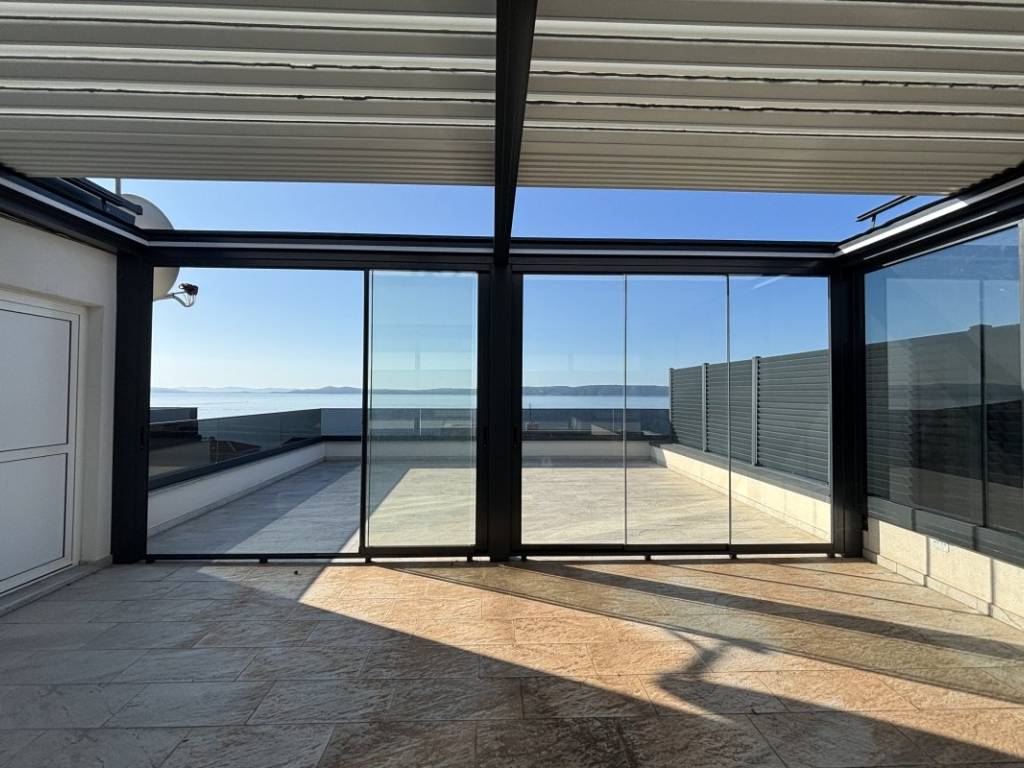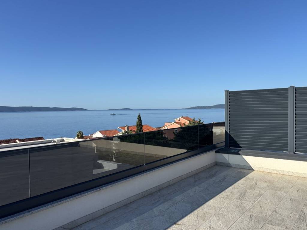 The penthouse is located on the second floor of a new building with a contemporary design, oriented to the south and north, which ensures plenty of natural light and a beautiful sea view in the living area and a comfortable temperature in the bedrooms. The apartment has 53,07 m of living space and consists of two bedrooms, a bathroom, a kitchen, a dining room and a living room with access to a 12,71 m loggia with a sea view. The biggest advantage of this property is the spacious roof terrace of 68,90 m, which offers a spectacular panoramic view of the sea and nearby islands an ideal place for outdoor socializing. It has a glazed bioclimatic pergola, ideal for year round living and openings for installing a summer kitchen and a massage tub.