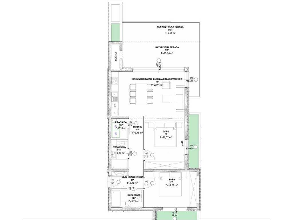 The apartment has 66,08 m and consists of an entrance and cloakroom with plenty of storage space, a hallway connecting all rooms, two modern bathrooms with quality equipment, two comfortable bedrooms, a laundry room and a kitchen with a dining room and a living room from which there is access to a spacious covered terrace of 15,54 m and an uncovered terrace of 9,66 m with an open sea view.