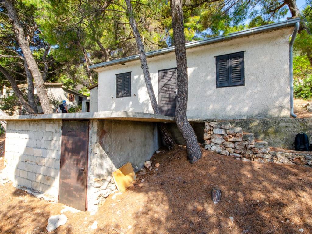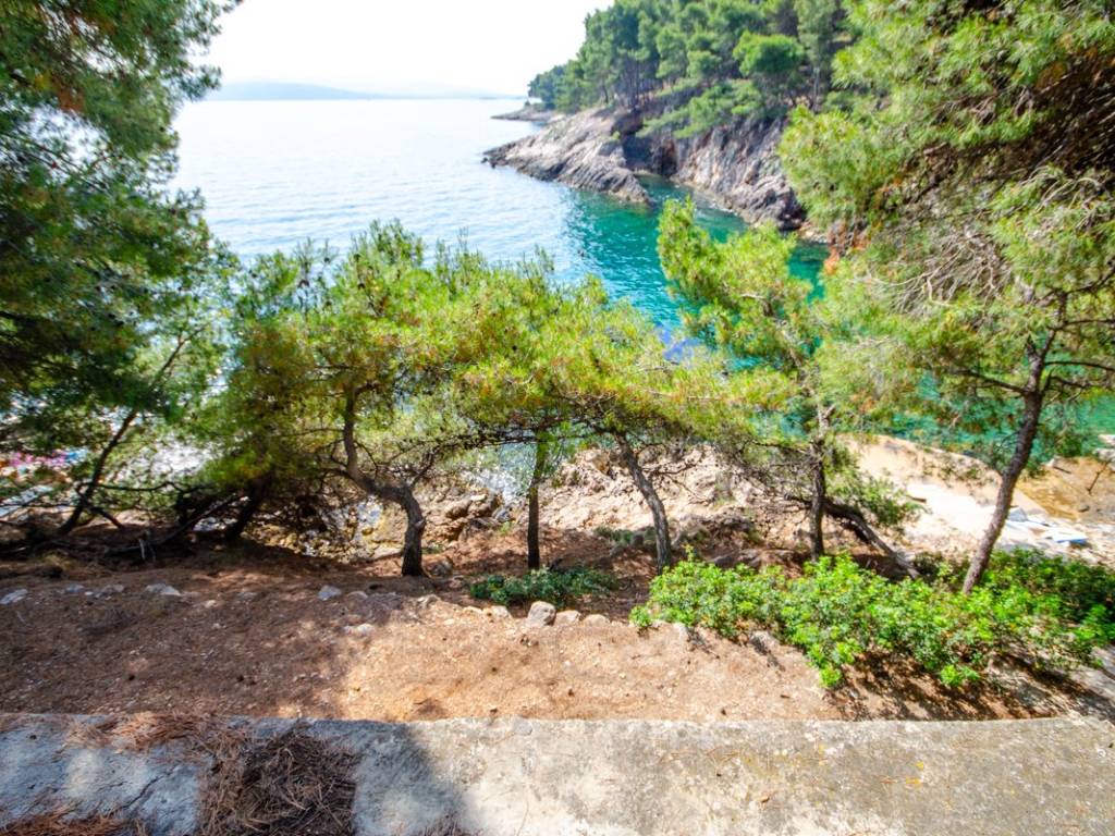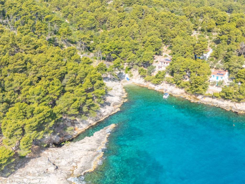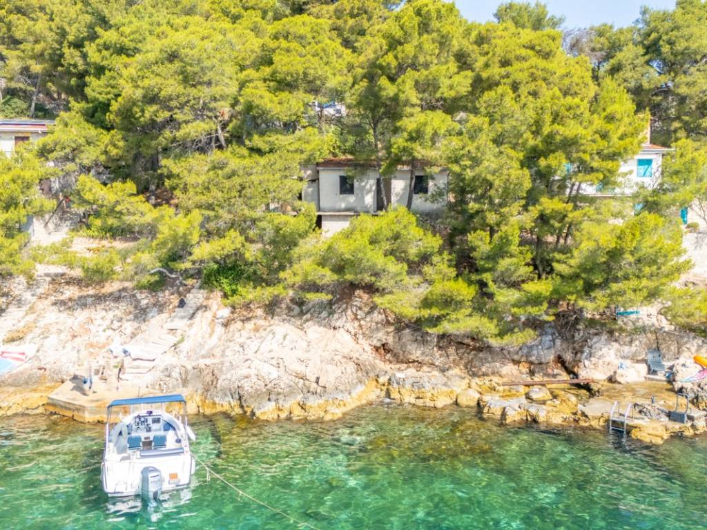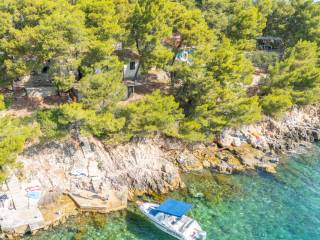 The total land area is 425 square meters, while the house itself covers 73 square meters. The property is situated in a secluded bay on the western side of the island, surrounded by dense pine forest, offering a high level of privacy and exceptional tranquility.