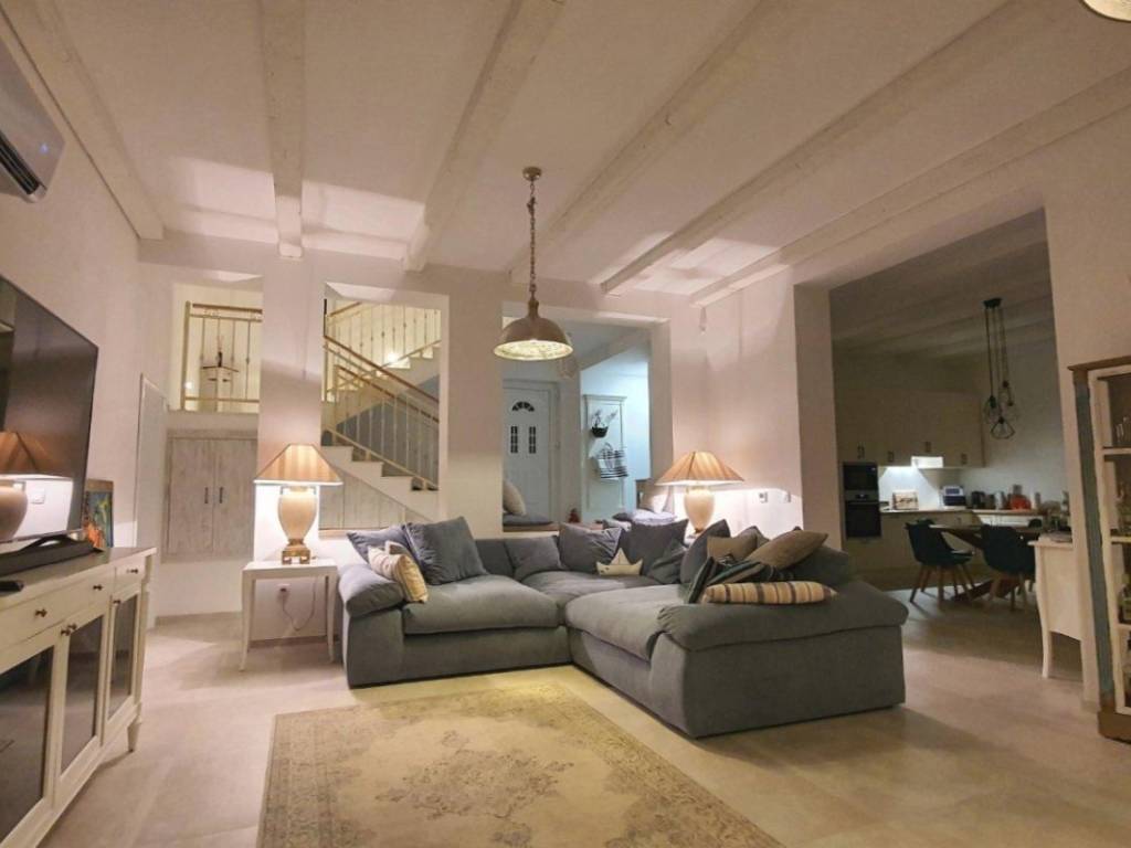 On the ground floor there is a spacious and bright, modernly decorated living room and a kitchen with a dining room. This entire space, and especially the kitchen, exudes a combination of American and Mediterranean design styles. On this floor there is also one bedroom with a bathroom and another separate bathroom.
